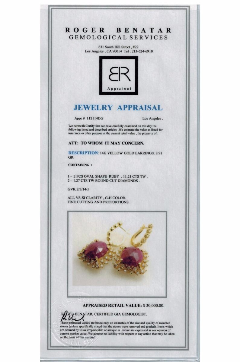 RUBY CABOCHION 11.21CT / DIAMOND 1.27CT / 14K YELLOW GOLD EARRING 8.91GRAM / GVK 2/3/14(5)