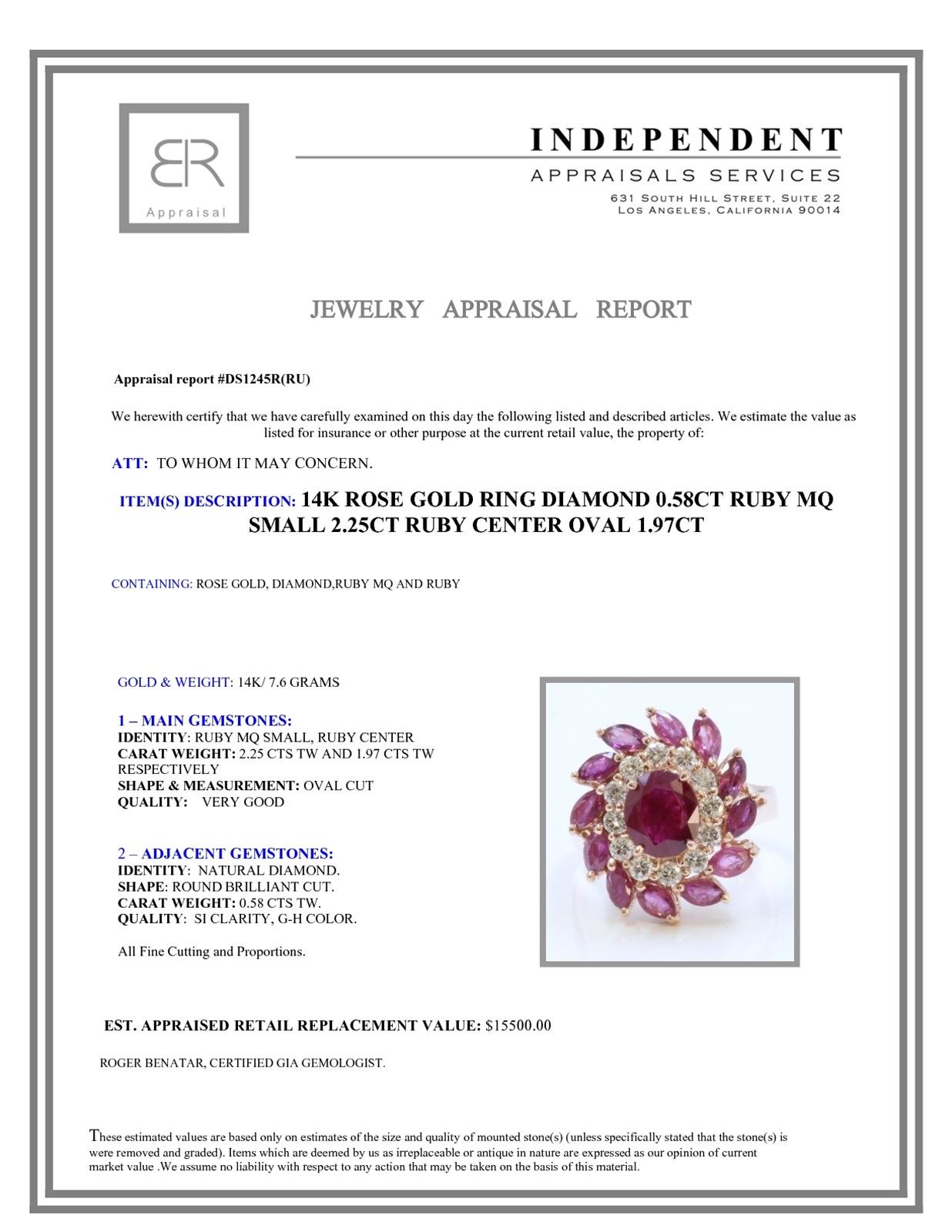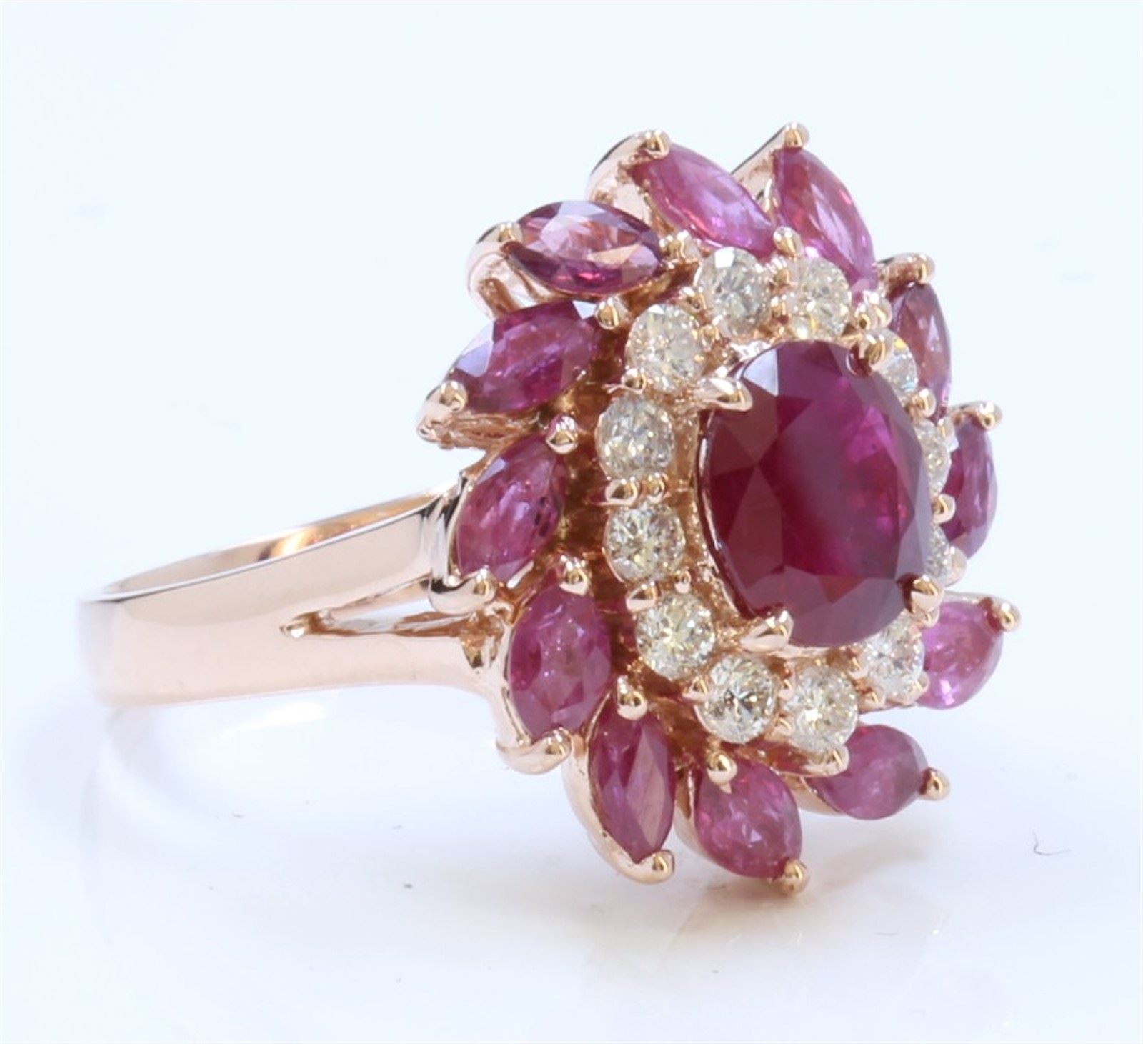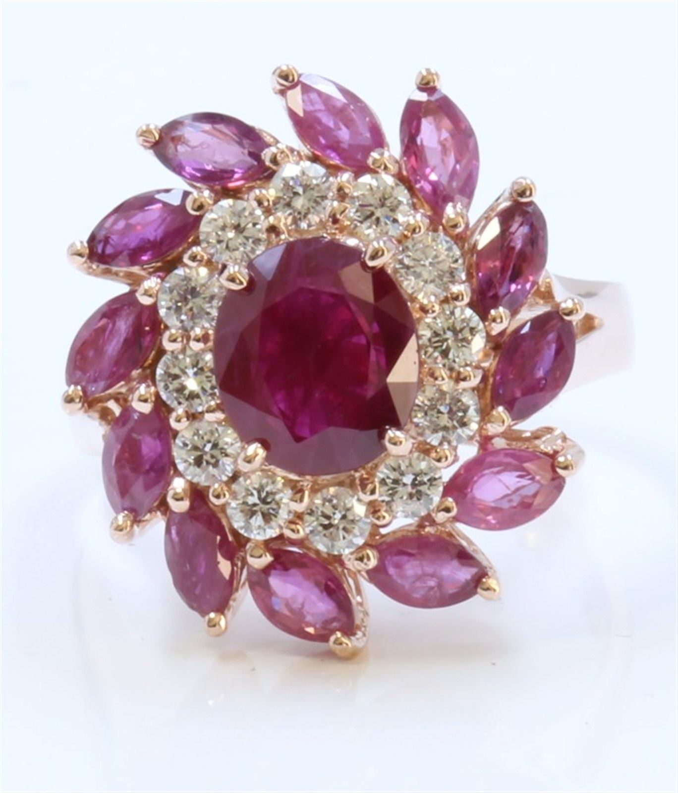 14K ROSE GOLD RING 7.6GRAM DIAMOND 0.58CT RUBY MQ SMALL 2.25CT RUBY CENTER OVAL 1.97CT