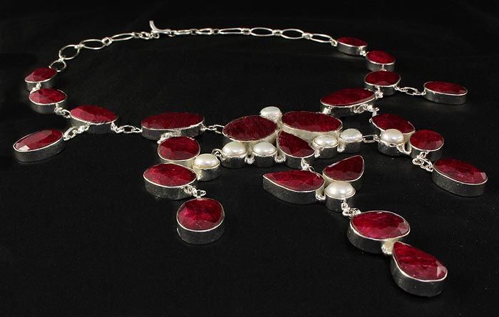 RUBY CORRUNDUM 124.50GRAMS SILVER STATEMENT NECKLACE **|**|** 19.0X4.0 INCHES MIX SHAPE RUBY CORRUNDUM W/ FRESHWATER PEARLS SILVER STATEMENT NECKLACE ; MSRP: $1600