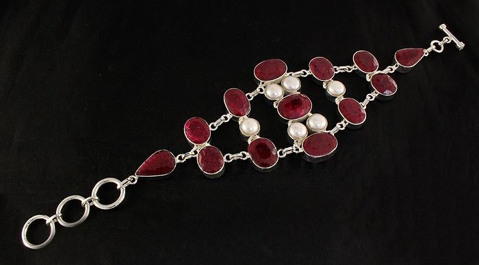 RUBY CORRUNDUM 47.80GRAMS FASHION SILVER BRACELET **|**|** 8.5X2.0 INCHES MIX SHAPE RUBY CORRUNDUM W/ FRESHWATER PEARLS SILVER BRACELET ; MSRP: $400