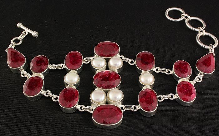 RUBY CORRUNDUM 47.80GRAMS FASHION SILVER BRACELET **|**|** 8.5X2.0 INCHES MIX SHAPE RUBY CORRUNDUM W/ FRESHWATER PEARLS SILVER BRACELET ; MSRP: $400