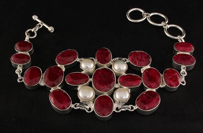 RUBY CORRUNDUM 47.85GRAMS FASHION SILVER BRACELET **|**|** 8.0X1.8 INCHES OVAL SHAPE RUBY CORRUNDUM W/ FRESHWATER PEARLS SILVER BRACELET ; MSRP: $500