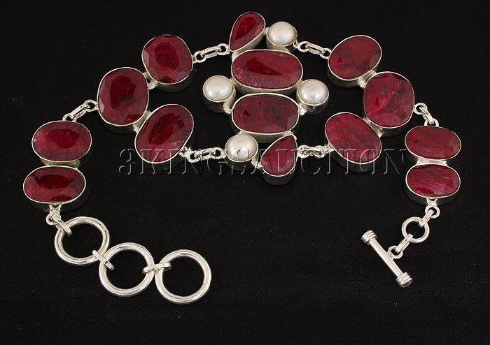 RUBY CORRUNDUM 56.95GRAMS FASHION SILVER BRACELET **|**|** 9.0X2.0 INCHES OVAL&PEAR SHAPE RUBY CORRUNDUM W/ FRESHWATER PEARLS SILVER BRACELET ; MSRP: $1600