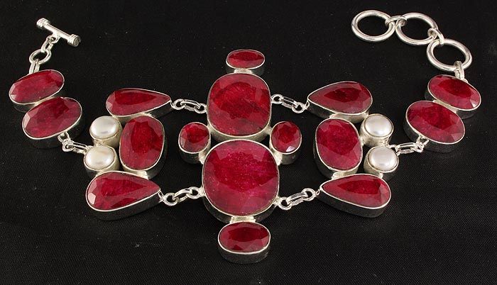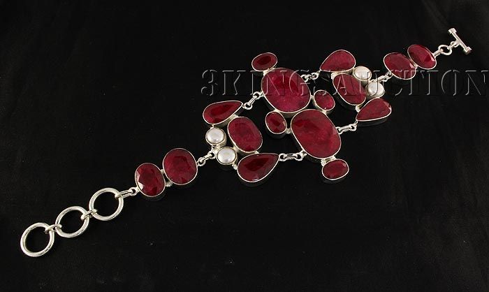 RUBY CORRUNDUM 65.15GRAMS FASHION SILVER BRACELET **|**|** 9.0X3.0 INCHES MIX SHAPE RUBY CORRUNDUM W/ FRESHWATER PEARLS SILVER BRACELET ; MSRP: $1800