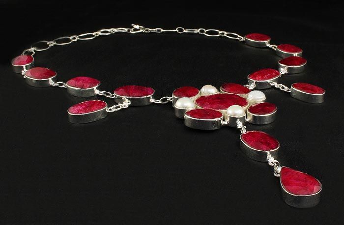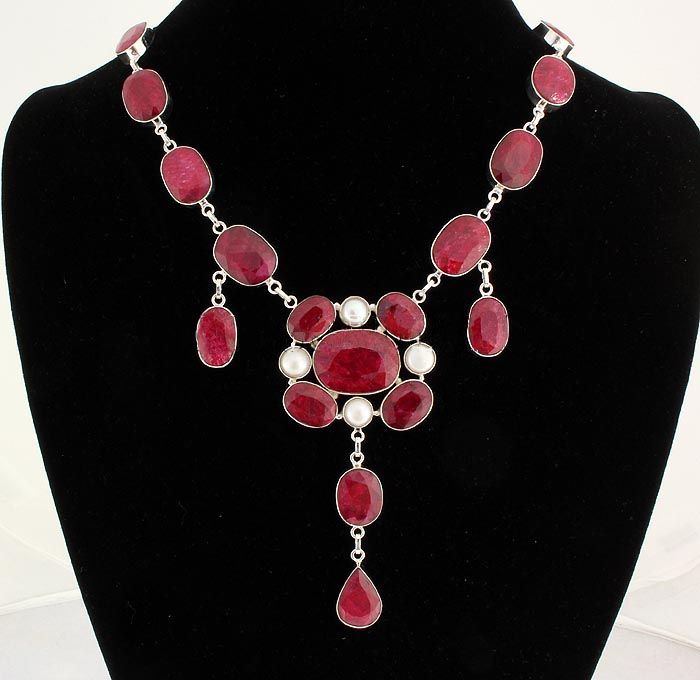 RUBY CORRUNDUM 79.98GRAMS SILVER STATEMENT NECKLACE **|**|** 18.0X4.0 INCHES OVAL & PEARL SHAPE RUBY CORRUNDUM W/ FRESHWATER SILVER NECKLACE ; MSRP: $2900