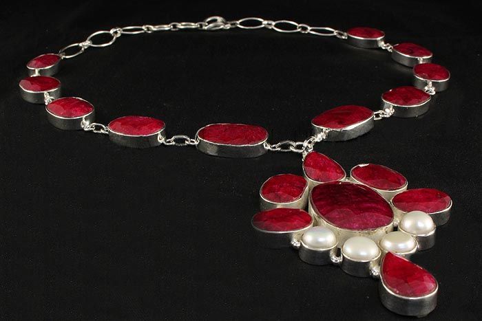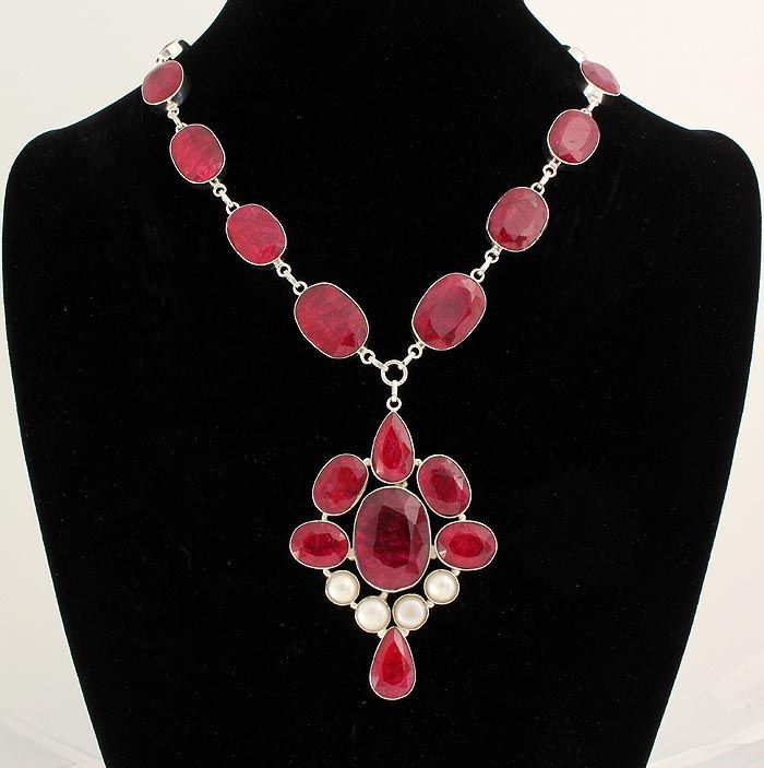 RUBY CORRUNDUM 85.14GRAMS SILVER STATEMENT NECKLACE **|**|** 18.0X3.0 INCHES MIX SHAPE RUBY CORRUNDUM W/ FRESHWATER PEARLS SILVER STATEMENT NECKLACE ; MSRP: $1100