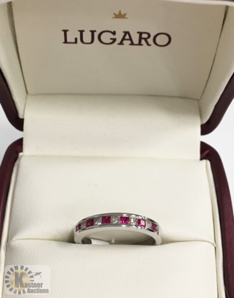 SIZE: 6.5 WEIGHT: 3.7 GRAMS METAL: 18K WHITE GOLD RUBY CARAT: 6= 0.42 CTS T.W. CUT: PRINCESS DIAMONDS CARAT: 5 = 0.28 CTS T.W. CLARITY: VVS-VS COLOUR: E-F CUT: PRINCESS RETAIL $950.00 SKU:503-10355