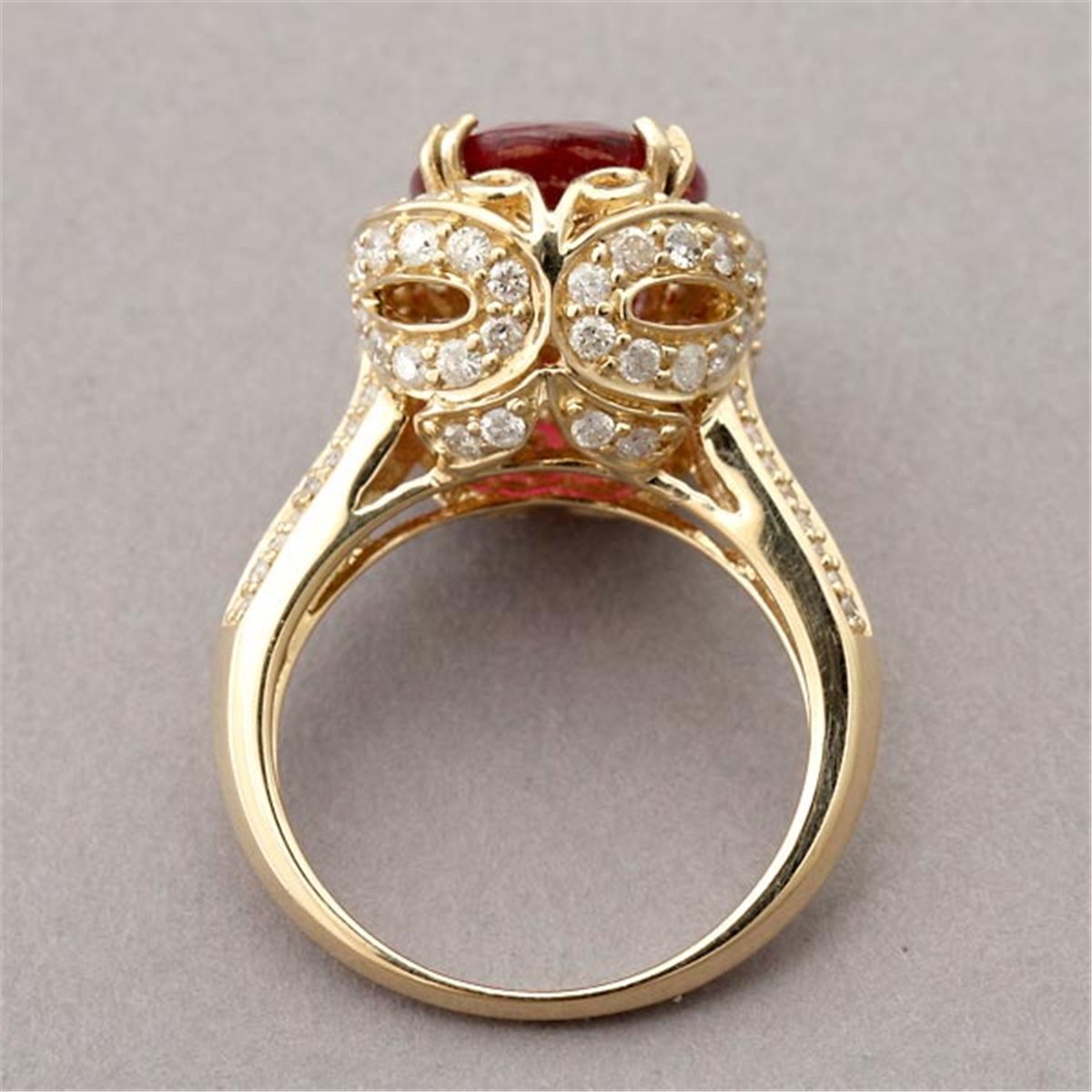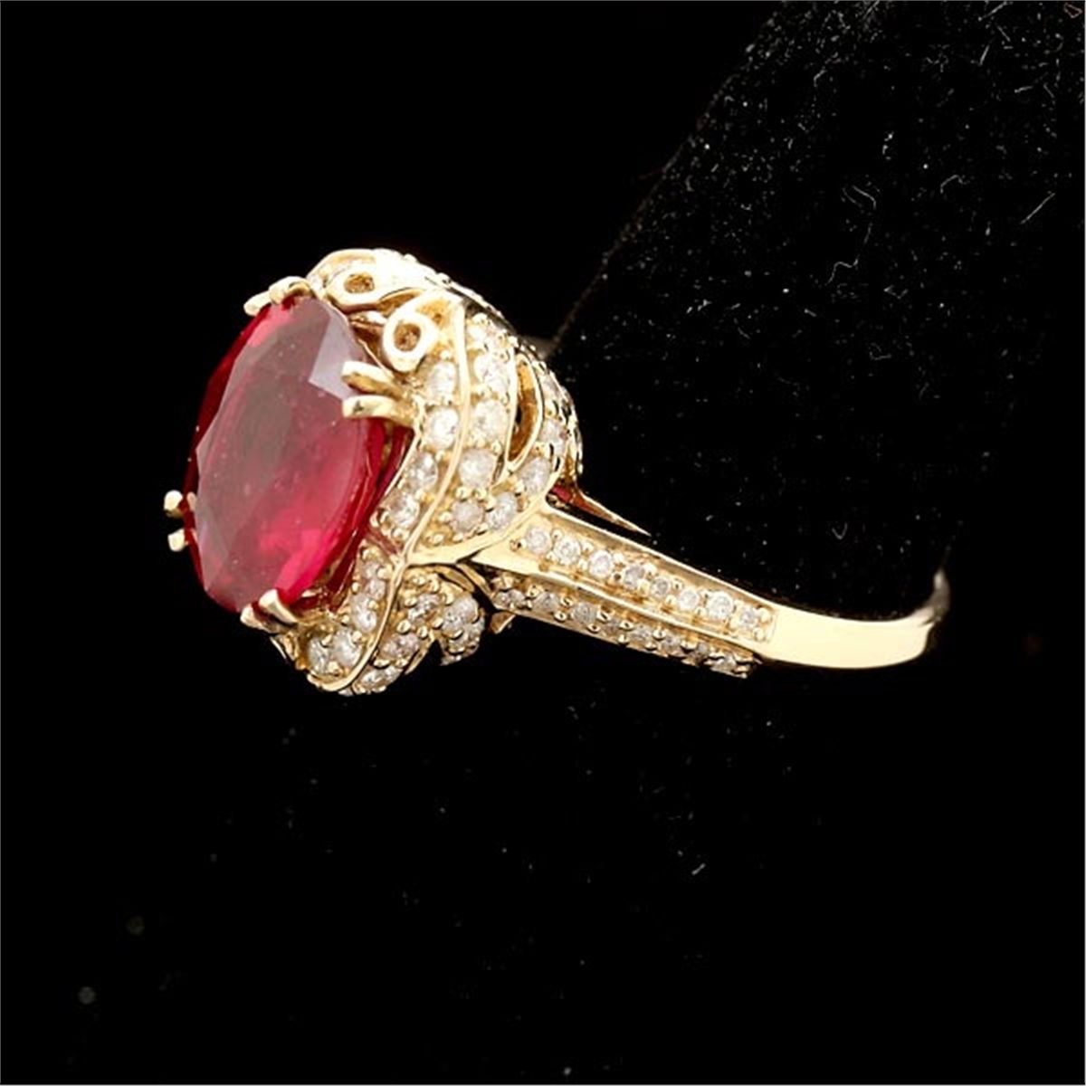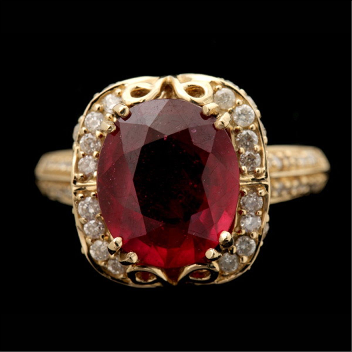 RUBY, DIAMOND, WHITE GOLD RING. Centering one oval-cut ruby measuring approximately 11 x 10 mm, accented by one hundred and eight full-cut diamonds weighing a total of approximately 1.00 ct., set in a 14k yellow gold mounting. Size 7, 4.90 dwts