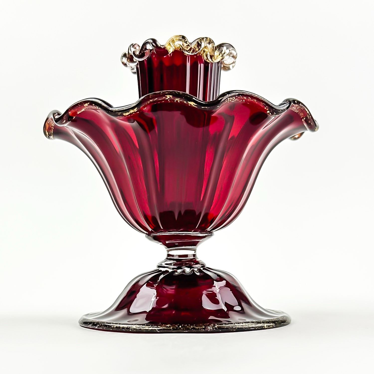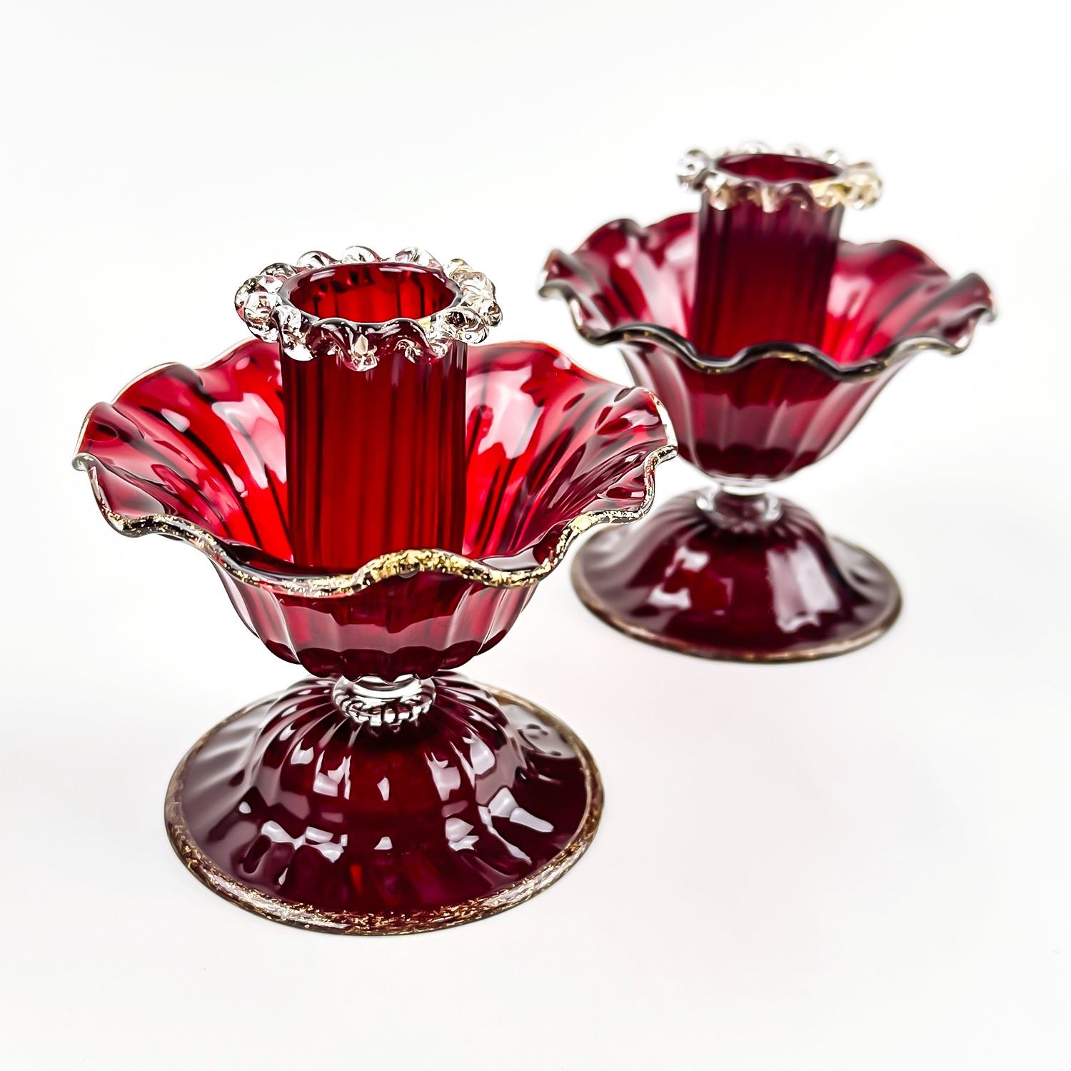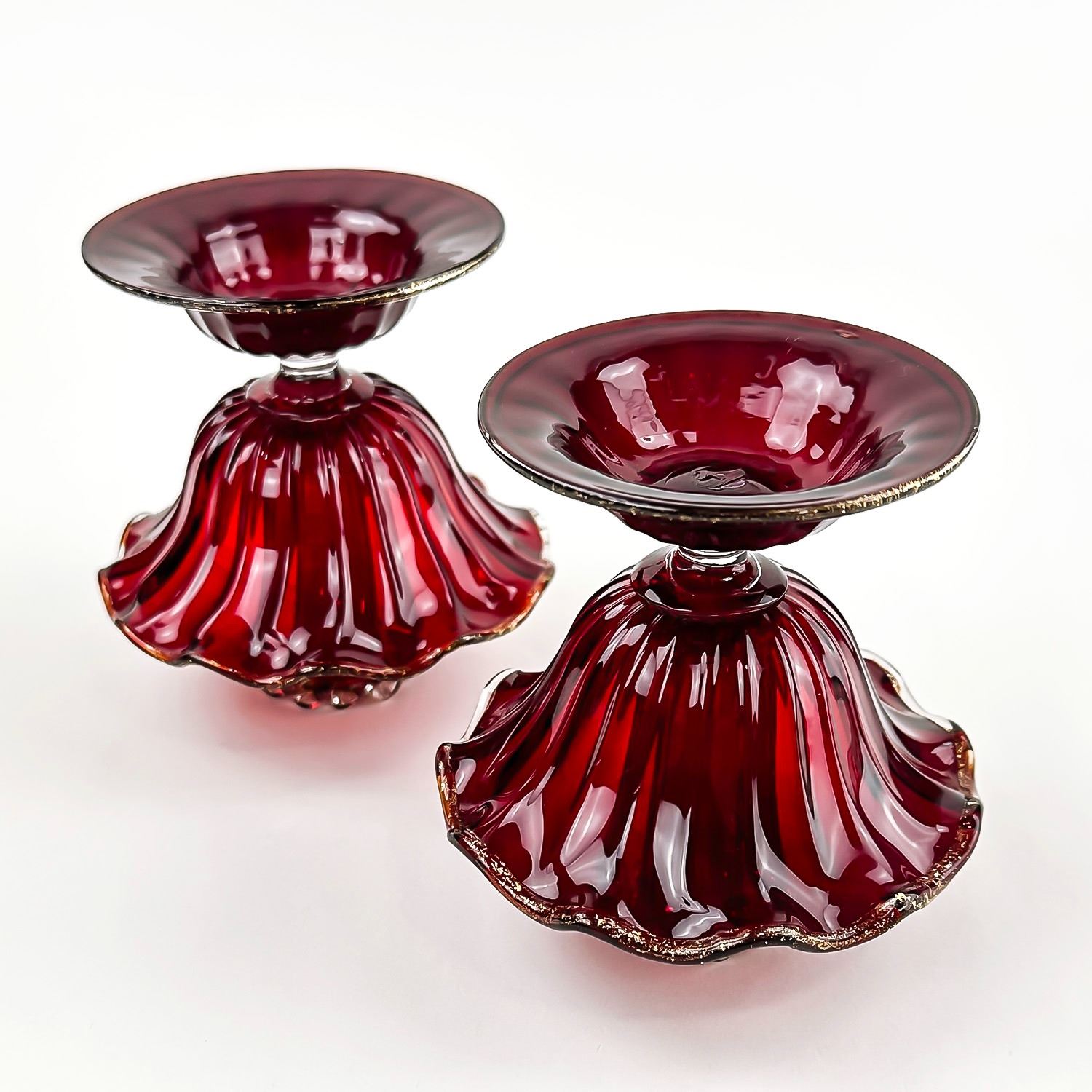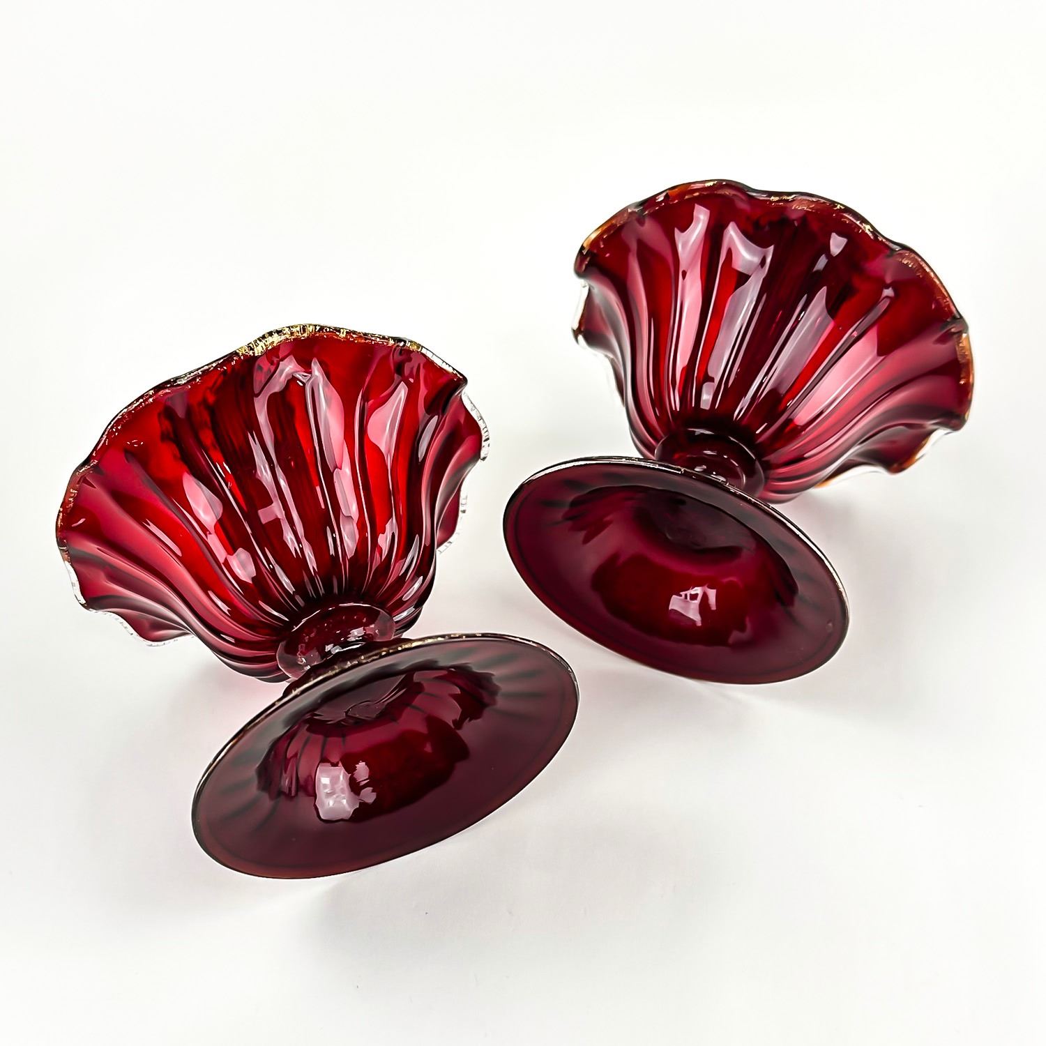 #8130 - PAIR OF VINTAGE MURANO VENETIAN SALVIATI OR FENTON ART GLASS FOOTED COMPOTES - CANDLE HOLDERS - GOLD FLECKS IN THE EDGES OF THE GLASS, ALSO KNOWN AS AVENTURINE. THESE ARE BOTH RUBY RED IN COLOUR AND FREE OF CRACKS, CHIPS OR REPAIRS. BEAUTIFUL VINTAGE PAIR OF HOME DECOR CANDLE STICKS. THEY EACH MEASURE APPROX. 3.75”(9.5 CM) TALL BY 3.75” (9.5 CM) AT WIDEST DIAMETER AND A 3 1/8” (8 CM) DIAMETER BASE.