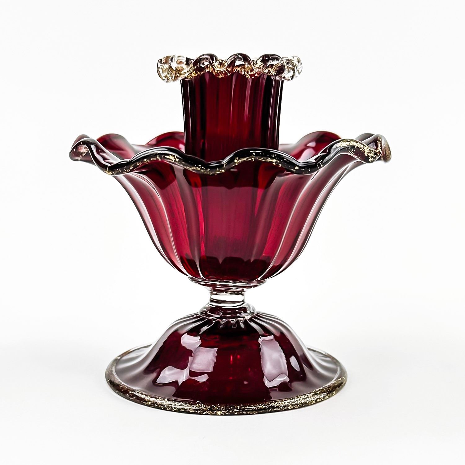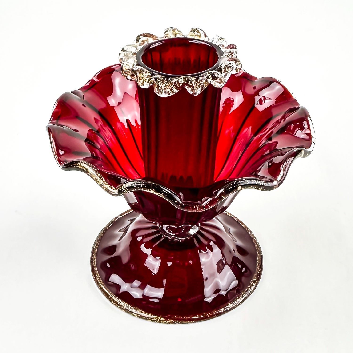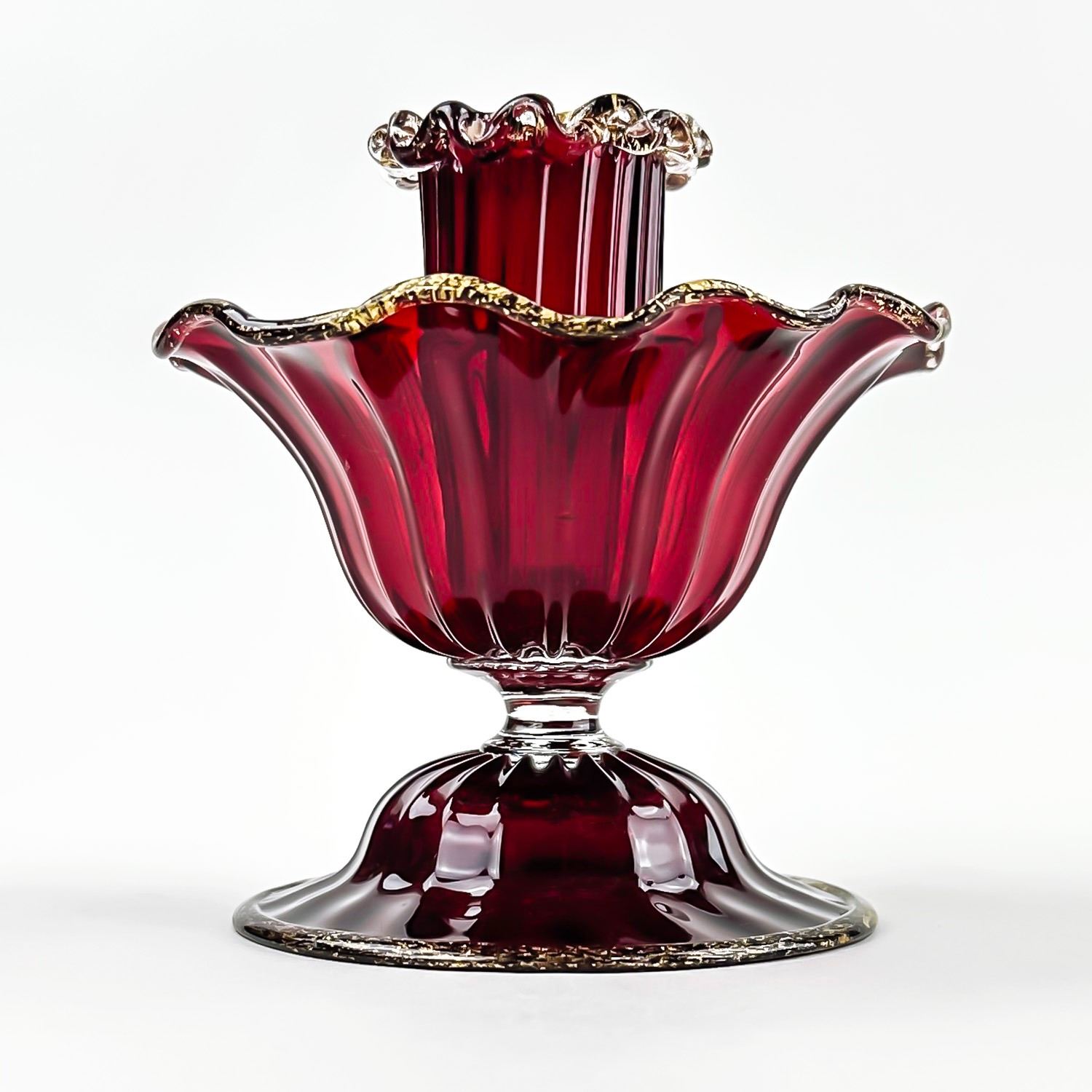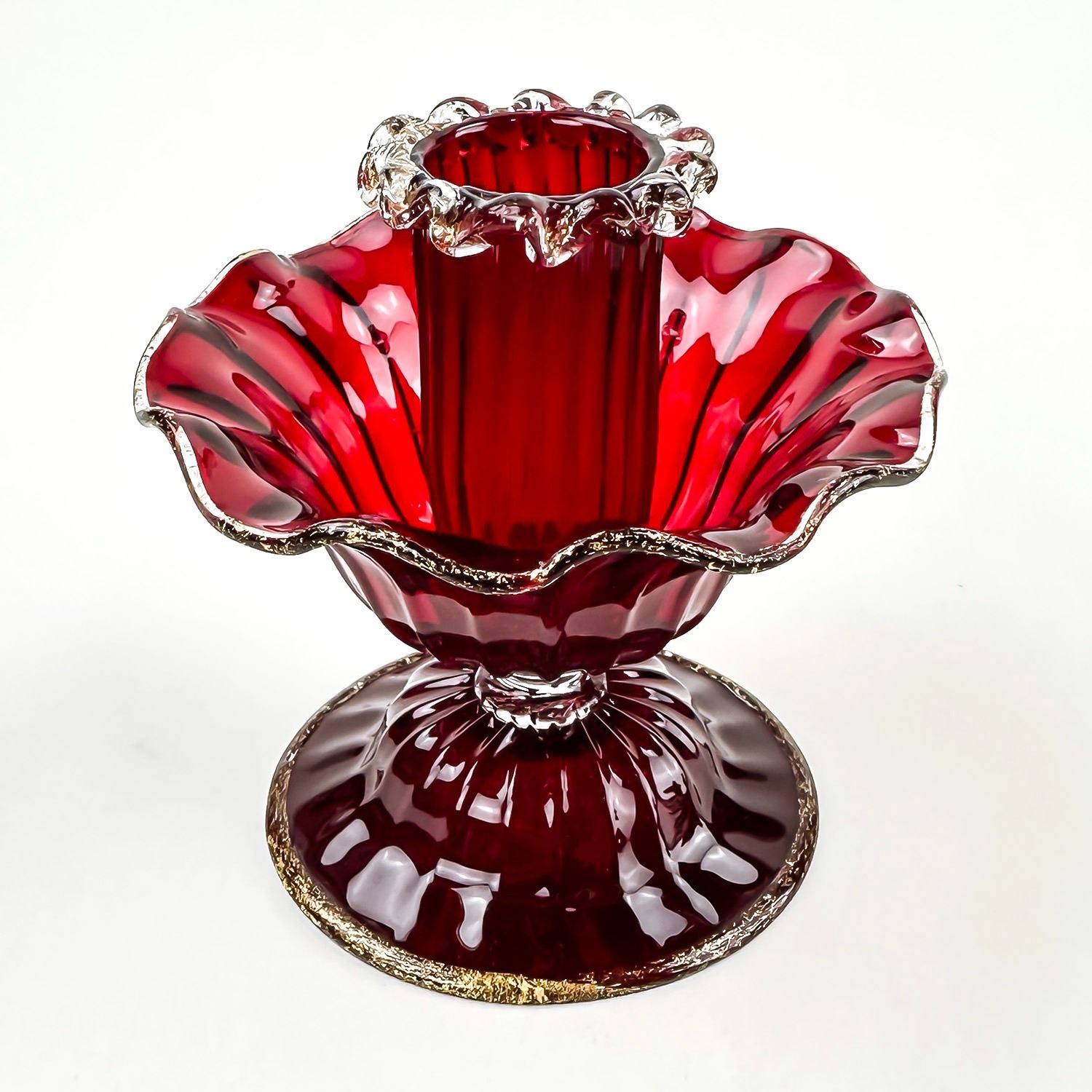 #8130 - PAIR OF VINTAGE MURANO VENETIAN SALVIATI OR FENTON ART GLASS FOOTED COMPOTES - CANDLE HOLDERS - GOLD FLECKS IN THE EDGES OF THE GLASS, ALSO KNOWN AS AVENTURINE. THESE ARE BOTH RUBY RED IN COLOUR AND FREE OF CRACKS, CHIPS OR REPAIRS. BEAUTIFUL VINTAGE PAIR OF HOME DECOR CANDLE STICKS. THEY EACH MEASURE APPROX. 3.75”(9.5 CM) TALL BY 3.75” (9.5 CM) AT WIDEST DIAMETER AND A 3 1/8” (8 CM) DIAMETER BASE.