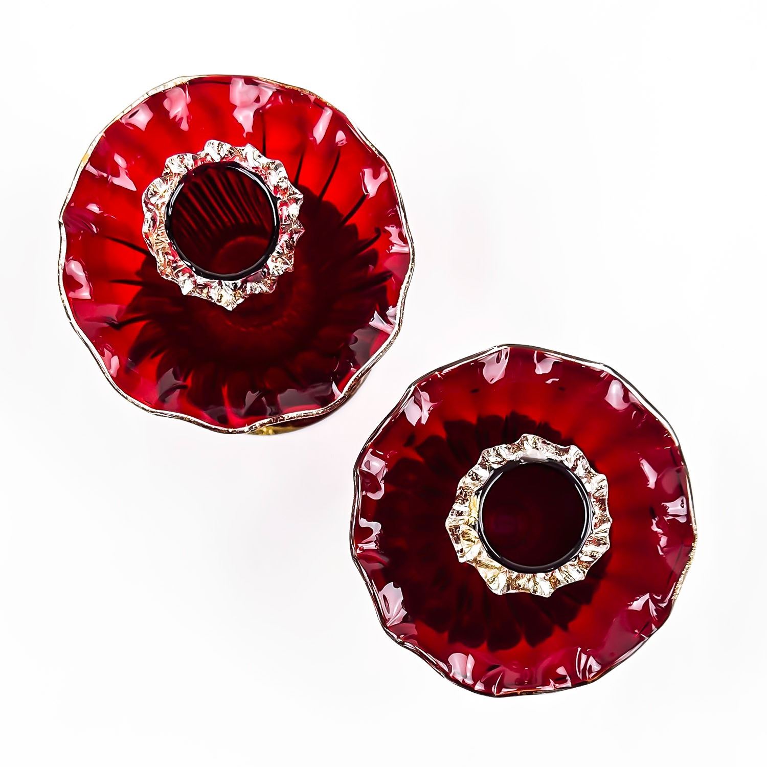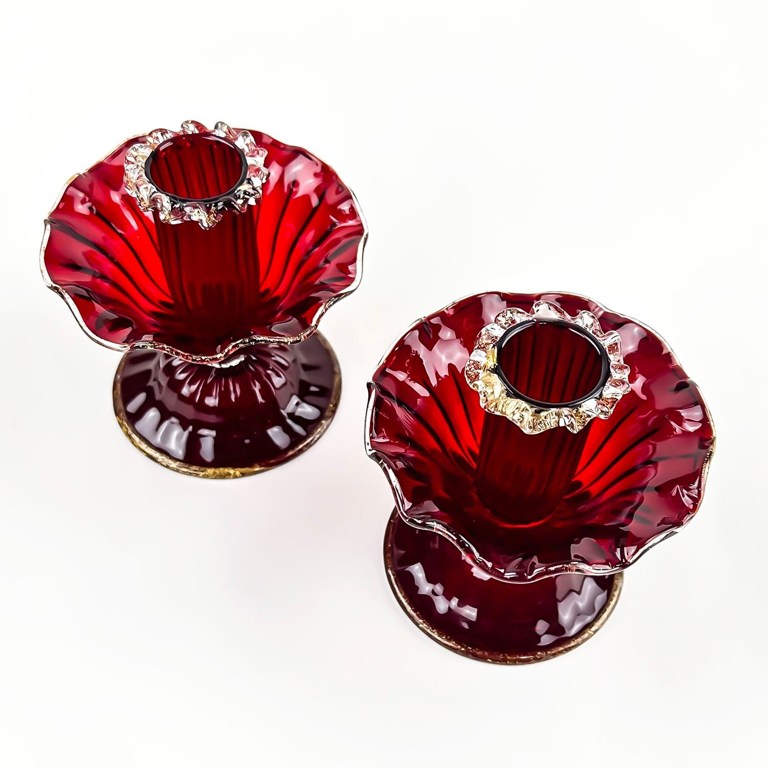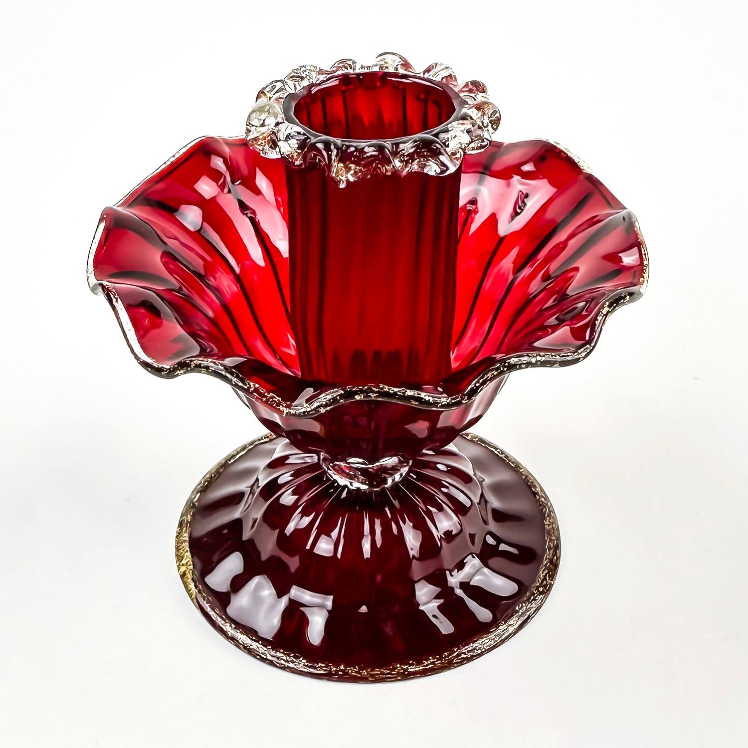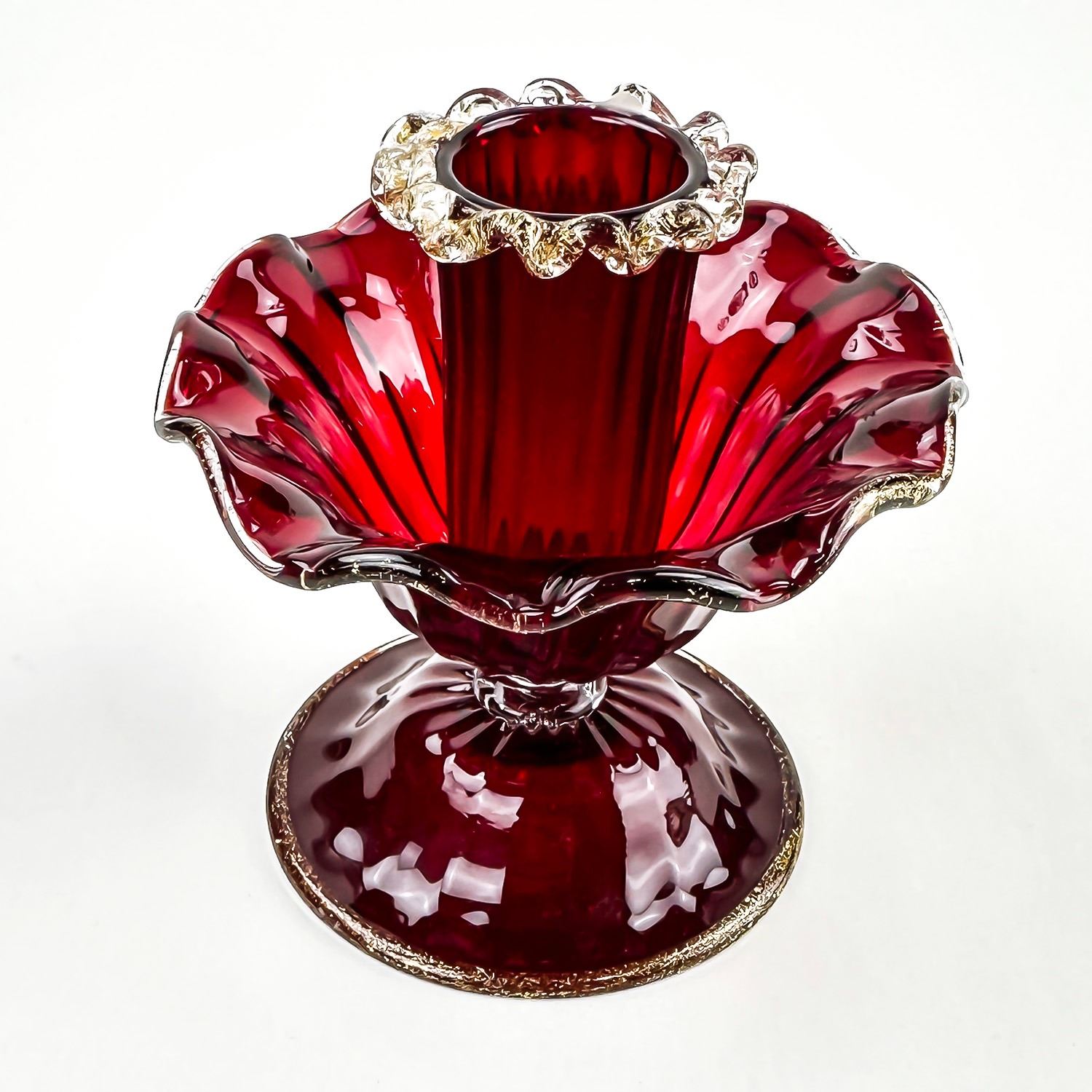 #8130 - PAIR OF VINTAGE MURANO VENETIAN SALVIATI OR FENTON ART GLASS FOOTED COMPOTES - CANDLE HOLDERS - GOLD FLECKS IN THE EDGES OF THE GLASS, ALSO KNOWN AS AVENTURINE. THESE ARE BOTH RUBY RED IN COLOUR AND FREE OF CRACKS, CHIPS OR REPAIRS. BEAUTIFUL VINTAGE PAIR OF HOME DECOR CANDLE STICKS. THEY EACH MEASURE APPROX. 3.75”(9.5 CM) TALL BY 3.75” (9.5 CM) AT WIDEST DIAMETER AND A 3 1/8” (8 CM) DIAMETER BASE.