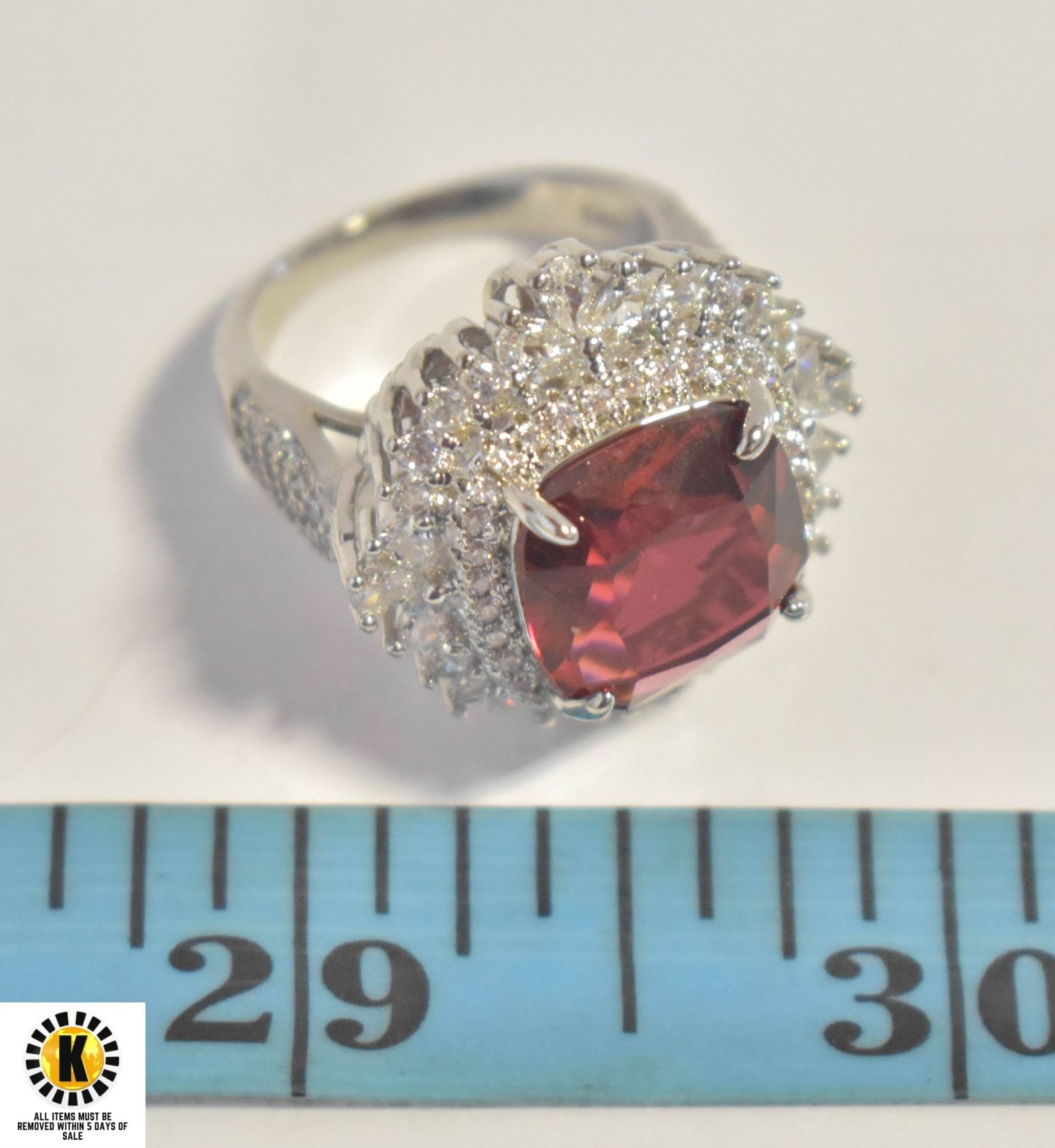 SIZE 6, SQUARE CUT RED STONE AND 2 ROWS OF HALO STYLE WHITE STONES GOING ONTO THE SHOULDERS OF THIS RING, STAMPED 925. JEWELLERY