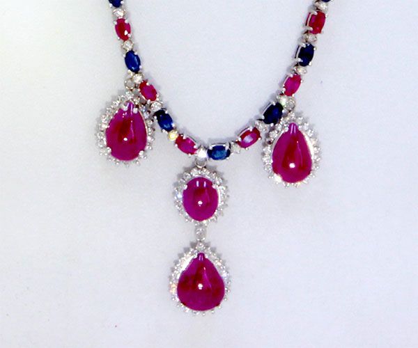 RUBY SMALL 10.82CT / BLUE SAPPHIRE 9.09CT / RUBY CAB 18.76CT, 14K W/G NECKLACE 22.93GRAM / DIAMOND 1.61CT