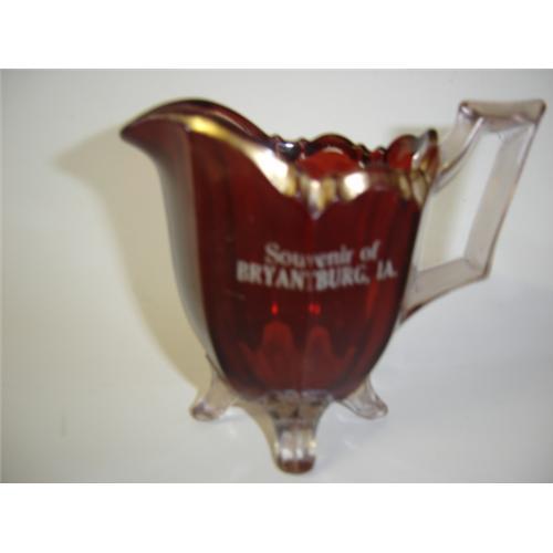RUBY STAIN AND GOLD LACE PITCHER, SOUVENIR OF BRYANTBURG, IA, HOME OF BESTY ROSS. ONLY, FOUR INCHES TALL.AND CRYSTAL FOOTED THREE OF THEM AND CRYSTAL HANDLE.SMALL CHIP ON FOOT.