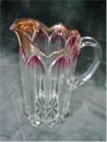 RUBY STAINED 9" PITCHER WITH DECORATIVE DESIGN.