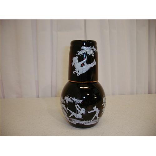 This is a very beautiful ruby glass tumble up set. The rim of the glass is trimmed in gold. And the unusual thing about this is that when the glass sits on the decanter the design on the glass is in the right direction. They both have a star on the bottom of them. This is the same style as a Mary Gregory, but it is not. The decanter is 7 5/8? tall and around it is 4 ½? and the glass is 3 5/8? tall and 2 7/8? around. They both weigh 2 lbs. <p>We do have more photographs that we can email if you are interested.