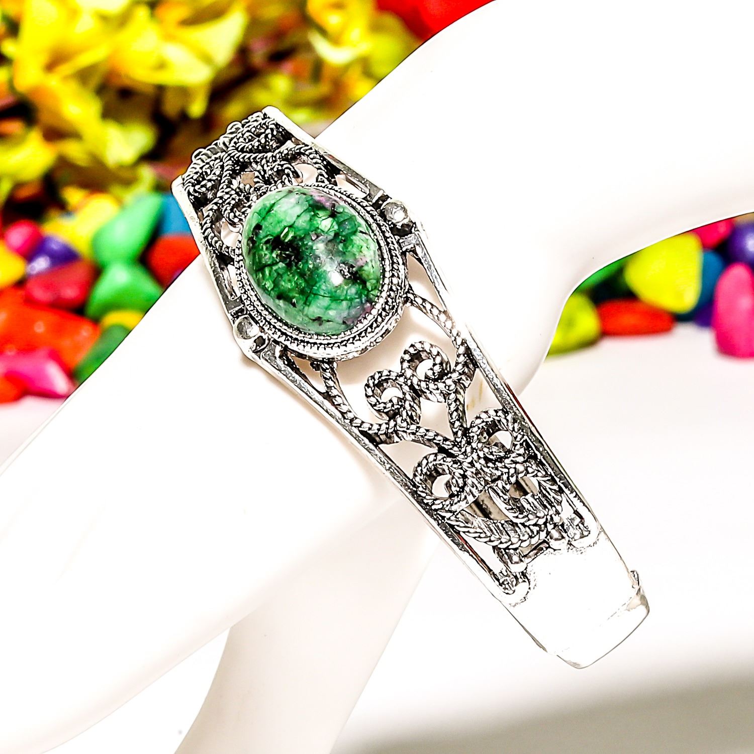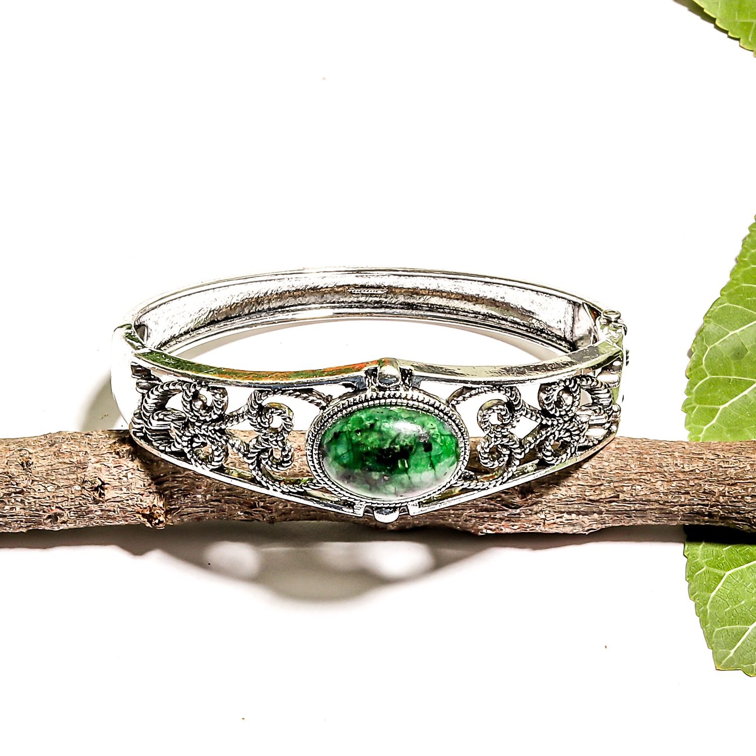 NATURAL RUBY ZOSITE GEMSTONE SILVER PLATED BRACELET BANGLE JEWELRY , Jewelry Type : Bangle Bracelet , Gemstone : Ruby Zosite , Gemstone Shape : Oval , Gemstone Color : Green, Red , Gemstone Size : 13x18mm , Metal : White Brass , Metal Purity : Silver Plated , Total Weight : 27.50 Gram , Product Code : SGJMXBAN1008