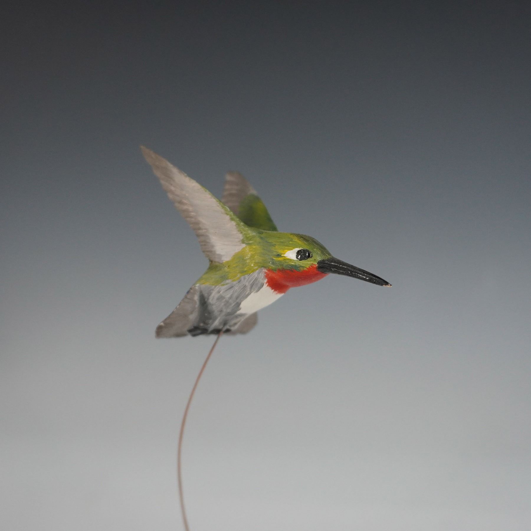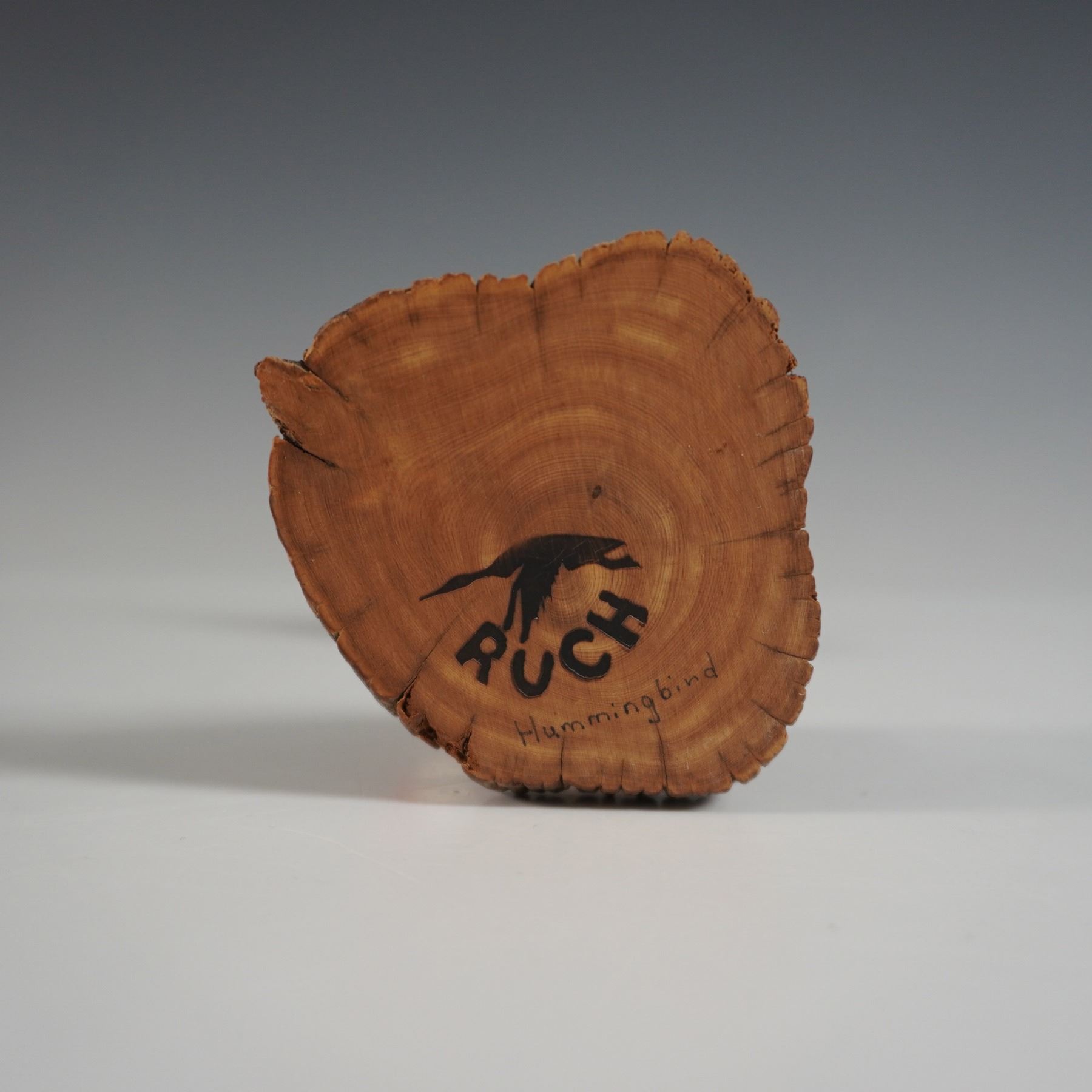 A finely hand-carved wooden hummingbird sculpture by RUCH, a family known for collaborating with local carvers on Vancouver Island, Canada. This exquisite piece showcases a ruby-throated hummingbird in mid-flight, meticulously hand-painted with vibrant natural hues. The bird is suspended by a delicate metal wire, creating a dynamic hovering effect above the natural wood base. The base is signed and labeled RUCH, a mark of the craftsmanship and artistry passed down through the family's work with skilled artisans. A striking collector's item for those who appreciate finely detailed wood carvings and nature-inspired art.