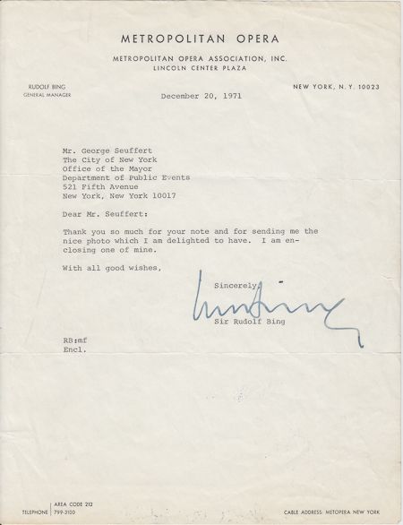 (1902 - 1997) Austrian-born opera impresario who managed the Metropolitan Opera from 1950 to 1972. T.L.S. 1p. 4to. on Metropolitan Opera letterhead, New York, Dec. 20, 1971 to George Seuffert at the New York Department of Public Events thanking him for "your note and for sending me the nice photo... I am enclosing one of mine." Usual folds with minor marginal tears, else very good. Offered together with LUCIANO PAVAROTTI (1935 - 2007) I.S.P. 5" x 7" b/w bust portrait of the late, great tenor on a promotional flyer for Decca Records. Fine. Together, two pieces.