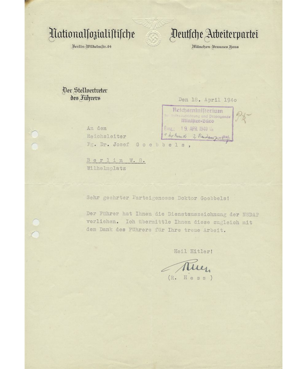 (1894 - 1987) Nazi German Deputy Fuehrer and second in command after Goering, Hess was one of Hitler's closest confidantes and friends. In an unauthorized peace mission, Hess flew a German fighter to England and surrendered, purportedly attempting to ally Germany with Great Britain against Russia. His mission, of course, failed and Hess was imprisoned at Spandau where he was found hanged in 1987. Fine content and association war-date T.L.S. on his official NSDAP letterhead, 1p. 4to., Berlin, Apr. 18, 1940 to Minister of Propaganda JOSEPH GOEBBELS. In part: "...The Fuhrer has awarded you the Service Award of the NSDAP. I send it to you enclosed with the thanks of the Fuhrer for your faithful work..." File holes at left, slightly scorched at top, else near fine.