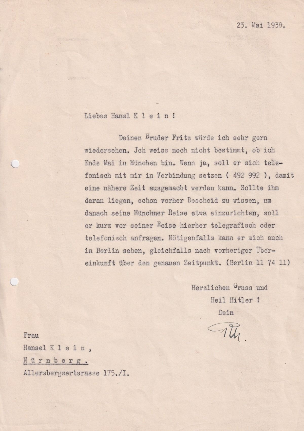 (1894 -1987) Deputy to Adolf Hitler until his flight to Scotland in an attempt to negotiate peace with the United Kingdom. Convicted at Nuremberg and serving a life sentence in Spandau Allied Prison, until he supposedly committed suicide by hanging with an extension cord in 1987, which has been disputed by his lawyer and his son. Retained carbon copy of a letter from Rudolf Hess to Hansel Klein, Nuremberg, dated 23. May 1938, initialed at the conclusion in black ink by Rudolf Hess 'RH'. Hess writes Klein about a reunion with Klein's brother Fritz, either in Munich or Berlin, concluding with a 'Heil Hitler! Your RH.' 8.25 x 11.75, file holes at left. Good condition. WITH: An original photo postcard of Rudolf Hess, Hermann Goering, and Joseph Goebbels, at the Adolf-Hitler-Square in Nuremberg 1937 during the Reichparteitag, published by the SA-Group Lower Saxony, 3.5 x 5.5 inches. Provenance: Both items originate from the estate of Ilse Hess. Two pieces.