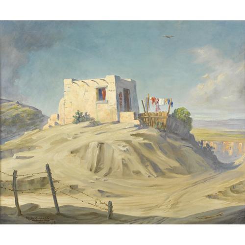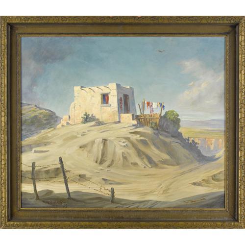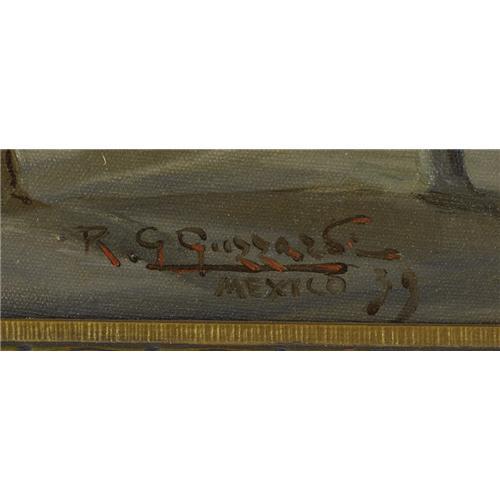 <B>RUDOLPH GUZZARDI (1903-1962)</B></I><BR><I>Juarez Mexico,</B></I> 1939<BR>Oil on canvas<BR>25in. x 30in.<BR>Signed, dated, and titled lower right<BR><BR>Born in Italy, Guzzardi moved to Houston, Texas, in 1933. He was chairman of the art department at Sacred Heart Dominican College. He was also a conservator and art dealer.<BR><BR>Provenance:<BR>Collection of Bill and Mary Cheek<BR><BR> <B>Condition Report:</B> Good condition. Repaired hole (patch) to sky above building. Period frame in excellent condition.<BR><BR><b>Shipping:</b> Requires 3rd Party Shipping (<a target="_blank" href="http://www.heritageauctions.com/common/shipping.php">view shipping information</a>)