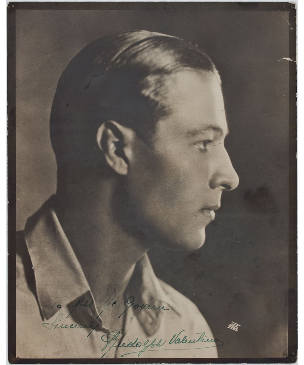 (1895 - 1926) American silent film star of legendary status, a romantic leading man and star of The Sheik. I.S.P. 8" x 10", sepia profile portrait of Valentino signed and inscribed to "Miss Mc Govern" in the lower portion of the image. Some minor marginal wear including creases and a tear, else very good condition.
