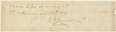 (1738 - 1824) Revolutionary War colonel and engineer responsible for the defensive works at Dorchester Heights and New York. Fine war-date partial A.D.S.: "Sworn before me in Camp at Ft. Montgomery August 5th 1779 R. Putnam Col. Comdg.". Mounted, slight show-through from text on verso, else very good. With a period engraving. Only three weeks earlier, Putnam had led Continental forces at Stony Point to divert British troops from the main attack. Fort Montgomery is perhaps only a mile or two from Stony Point.