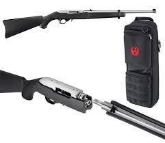 Description:RUG 10/22-TD 22LR SS BLK SYN Manufacturer:Ruger Model #:10/22 "Take Down" Type:Rifle: Semi-Auto Finish:Polished Stainless Steel Barrel Stock:Black Synthetic Sights:Front: Gold Bead Rear: Folding Leaf Barrel Length:18.5" Overall Length:37" Weight:4.67 lbs Caliber:22LR Capacity:10+1 Action:Semi-Automatic # of Mags:1 Receiver:Drilled & Tapped Features:Scope Base Adapter, Detachable Rotary Magazine Rifling: 1-16" RH, Black Cordura Takedown Case