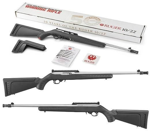 RUK1022-50YR PRODUCT DETAILS FAMILY:10/22 Series MODEL:10/22 50th Anniversary Edition TYPE:Rifle ACTION:Semi-Auto FINISH:Clear Satin Stainless STOCK/FRAME:Synthetic Stock STOCK/GRIPS:Black Composite CALIBER/GAUGE:22 LR CAPACITY:10+1 # OF MAGS:1 MAGAZINE DESC:10 rd. BARREL:18.5" OVERALL LENGTH:37" RATE-OF-TWIST:1-in-16" SIGHTS:Adjustable Rifle Sight SAFETY:2 Position Crossbolt