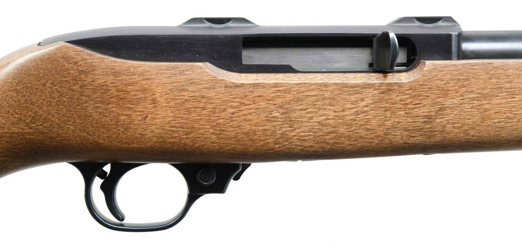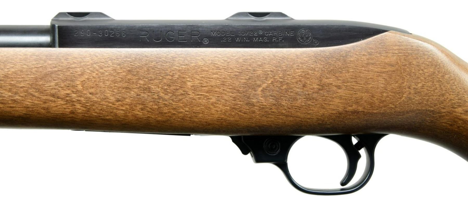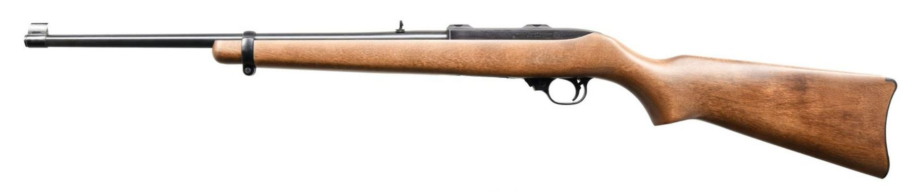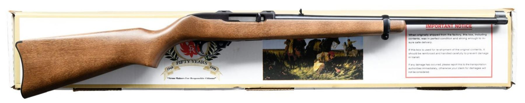 Cal. 22 Win Mag. S# 290-30266. Bbl. 18 1/2" Brass bead front sight. Folding leaf rear sight. Receiver has factory scope bases. Mfg. 2001. Blue & anodized finishes. Walnut stock. MAGS: 1-9 rd. UNATTACHED ACCESSORIES: matching numbered factory box w/ cable lock, manual & Ruger rings. CONDITION: all aspects rate very good plus or better w/ a few light handling marks. PROVENANCE: The Collection of Gun Sport Ltd owned by Jon R. Thomas. (23-3692/MJC). MODERN. $500-800.