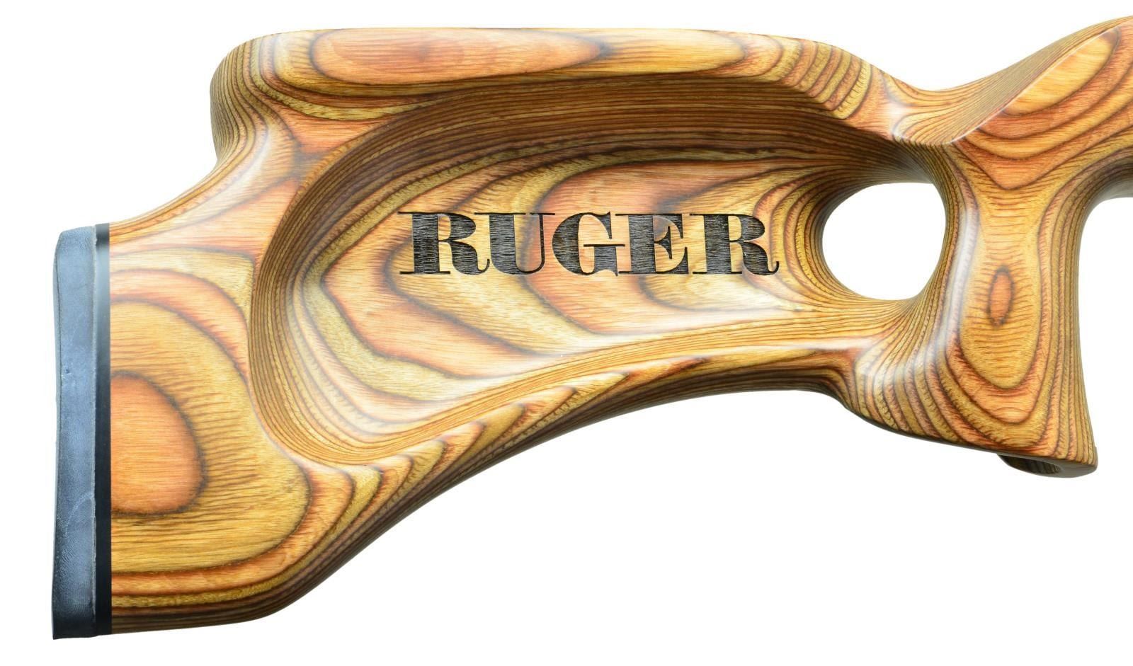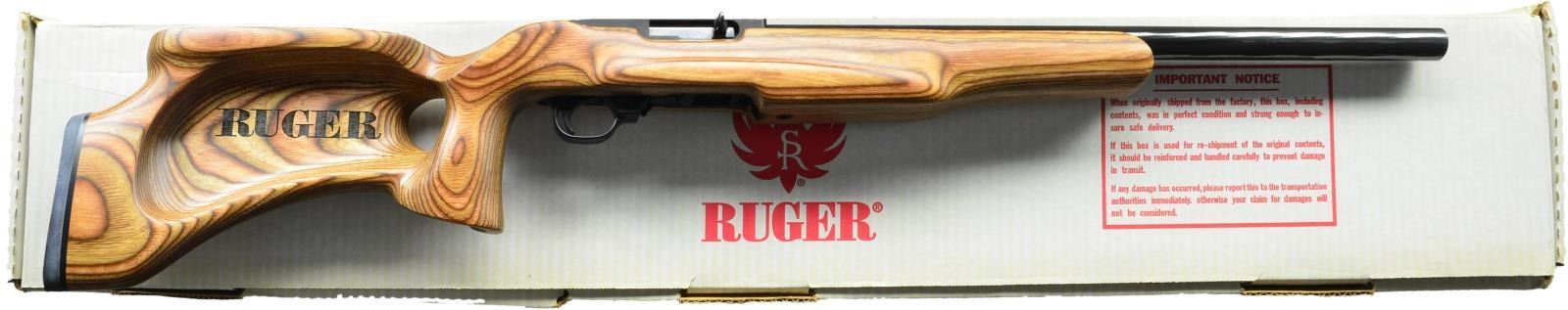 Cal. 22 LR. S# 248-70468. Bbl. 20" spiral fluted hammer forged & blued w/ out provision for sights. Mfg. 1998 w/ catalog # 01138; target model w/ brown laminated Barracuda style thumb hole target stock having RUGER laser engraved into recess on right side of buttstock. MAGS: 1 factory 10 rd. UNATTACHED ACCESSORIES: original box w/ packaging. CONDITION: all aspects near excellent w/ new appearance. (22-2148/NW). MODERN. $450-600.