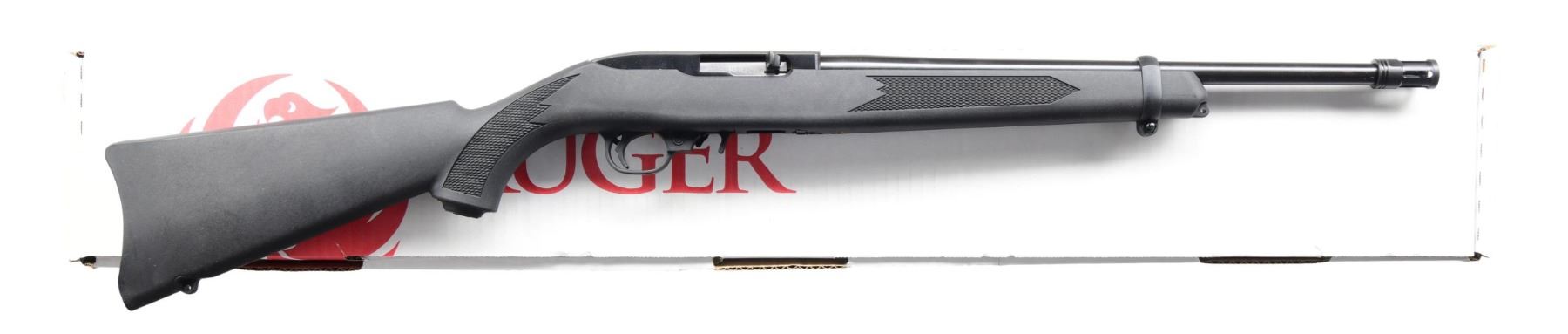 Cal. 22 LR. S# 0010-62095. Bbl. 16 1/4" w/ flash hider. No sights present but receiver is factory drilled & tapped for scope mounting. Matte black finish. Black synthetic pistol grip w/ bottom mounted sling studs. MAGS: 1-10 rd. UNATTACHED ACCESSORIES: matching numbered factory box w/ manual, cable lock & Weaver style scope mount. CONDITION: all aspects near excellent. (23-6432/MJC). MODERN. $150-250.