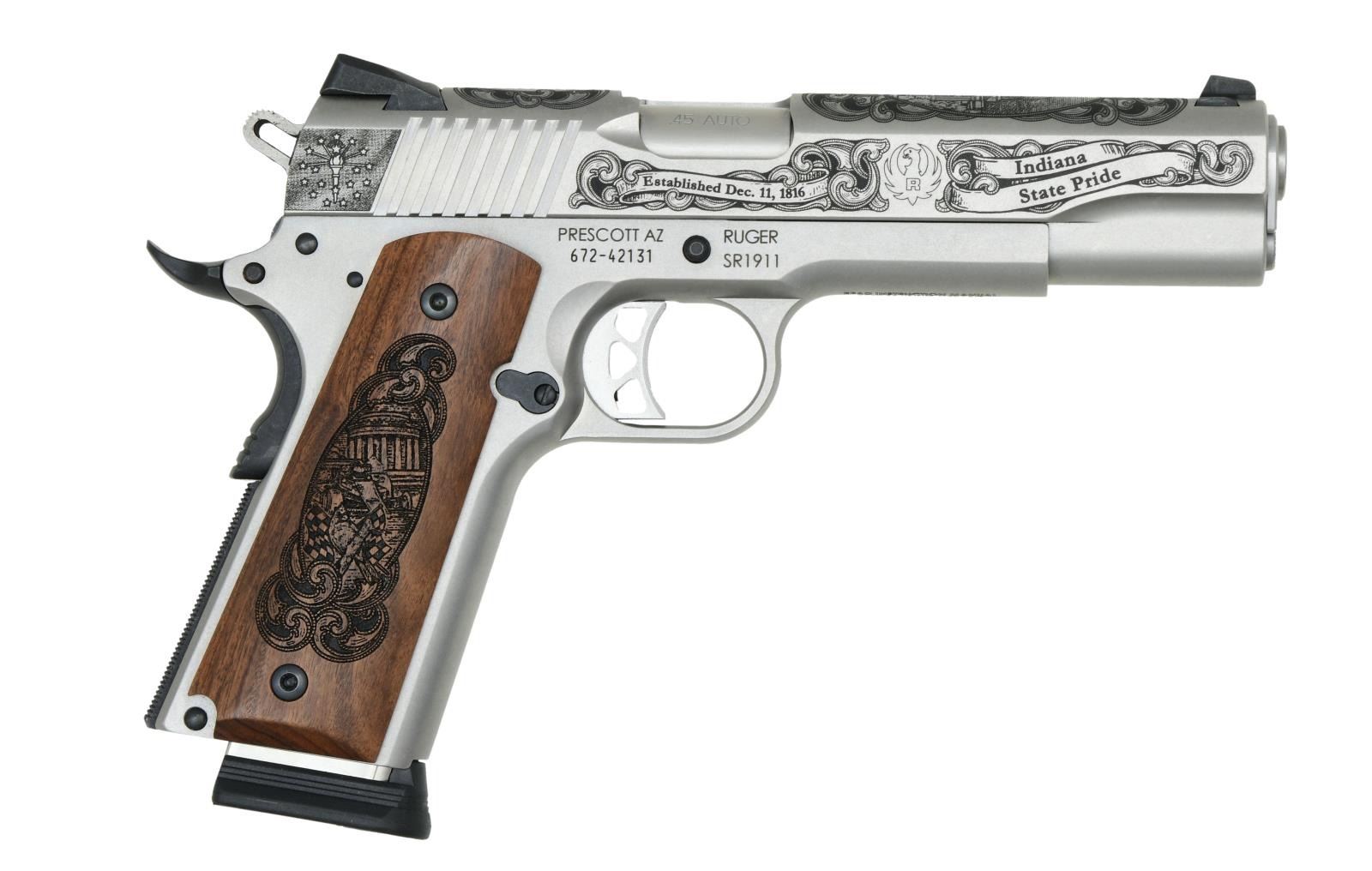 SEMI-AUTO PISTOL. Cal. 45 ACP. S# 672-42131. Bbl. 5" throated stainless with chamber inspection port. Mfg. 2016 (2011 to date for all SR1911's) as Model 06700 in Prescott, AZ, with distinctive gray-toned machine engraving honoring the Hoosier state with a steamboat vignette, banners, and the American flag on the left rear of the slide. Top of the slide behind the ejection port has "24 of 100"; the front has a state capitol vignette. Laser-engraved walnut grips (retained by Allen head screws), honoring the state's prowess in basketball plus the Indianapolis 500. Standard enhanced Ruger features include an integral plunger tube, an enlarged and flared ejection port, an extended magazine release, a silver skeletonized trigger with overtravel adjustment, a black flat checkered mainspring housing, a black stylized beavertail grip safety with memory pad, a skeletonized hammer, a flared magazine well, and extended thumb safety. Slide has dovetailed 3-dot sight set (windage adjustable rear) and slanted square-cut cocking grooves. MAGS: 2 factory stainless TOTAL; 8 rd. with push button black plastic bumper pad and 7 rd. with standard flat integral base drilled and tapped for bumper. UNATTACHED ACCESSORIES: matching numbered factory box with packaging to include original Ruger laminated hardwood checkered double diamond grips with silver eagle medallions plus Historical Armory sticker on box lid. CONDITION: all aspects are near excellent, appearing new and unfired. (23-6923/NW). MODERN. $1,000-1,400.