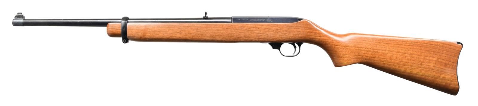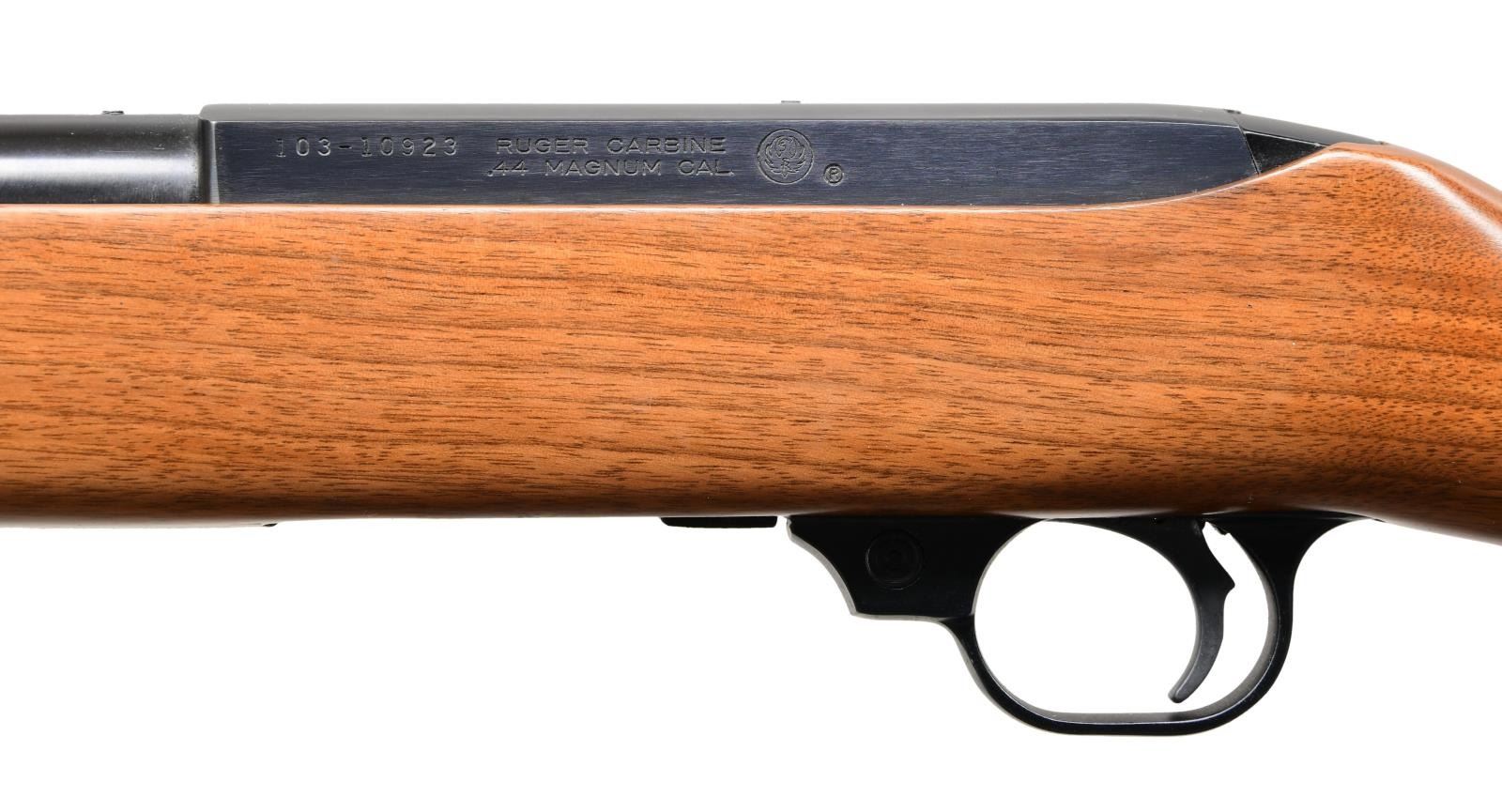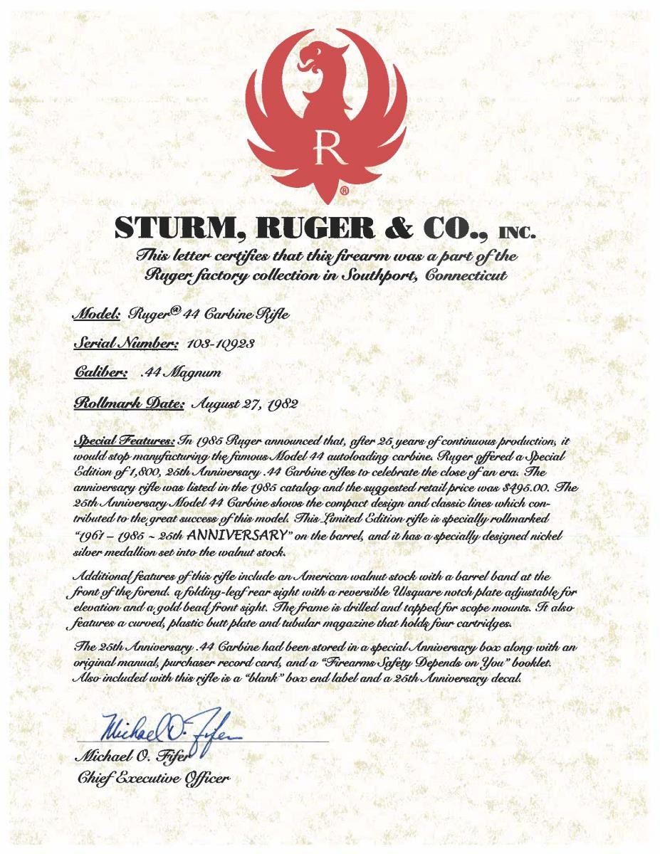 Cal. 44 Mag. S# 103-10923. Bbl. 18 1/2" with sights of brass bead front plus folding rear with white diamond. Mfg. 1983 (1961-1985) per noted RENE Reference Guide yet factory website states shipped 2003; likely from a Ruger benefit auction. In 1885 Ruger announced there would be 1,800 Anniversary units available at $495 with American walnut stocks and metal buttplates (error in announcement as Ruger used Celcon plastic buttplates for these, plus for all carbines starting in 1976). Factory Model number 01013 and catalog designation of YR25-44R. Approx. 5,000 Anniversary models produced per noted RENE Reference Guide as a result of cleaning up unsold inventory. Discontinuance was caused mainly by competition from noticeably less expensive Remington Model 742's aggressively marketed nationwide at large sporting goods outlets, etc. Anniversary markings on right side of barrel next to receiver plus "INC." and "warning marks" with its Southport address. Last variation with walnut stock having square cut at forend and pewter colored Anniversary disk on right side of buttstock. Cartridge release button at loading port plus steel cartridge guide in top front of receiver held by 2 rivets rather than screws which were often confused by consumers to be a scope base provision yet factory drilled and tapped at rear of barrel plus rear of receiver for scope mounting. In high demand as compact, fast handling brush hunting carbine that weighs less fully loaded (internal 4 rd. magazine) than the popular lever action carbine weighs empty. UNATTACHED ACCESORIES: original 25th Anniversary marked box with packaging to include original manual (no red inked "out of production" marks) dated 4/82. CO. Outer shipping box addressed to FFL in CO. Original Ruger Packing Slip. CONDITION: excellent overall appearing new and unfired. (23-6448/NW). MODERN. $900-1,400.