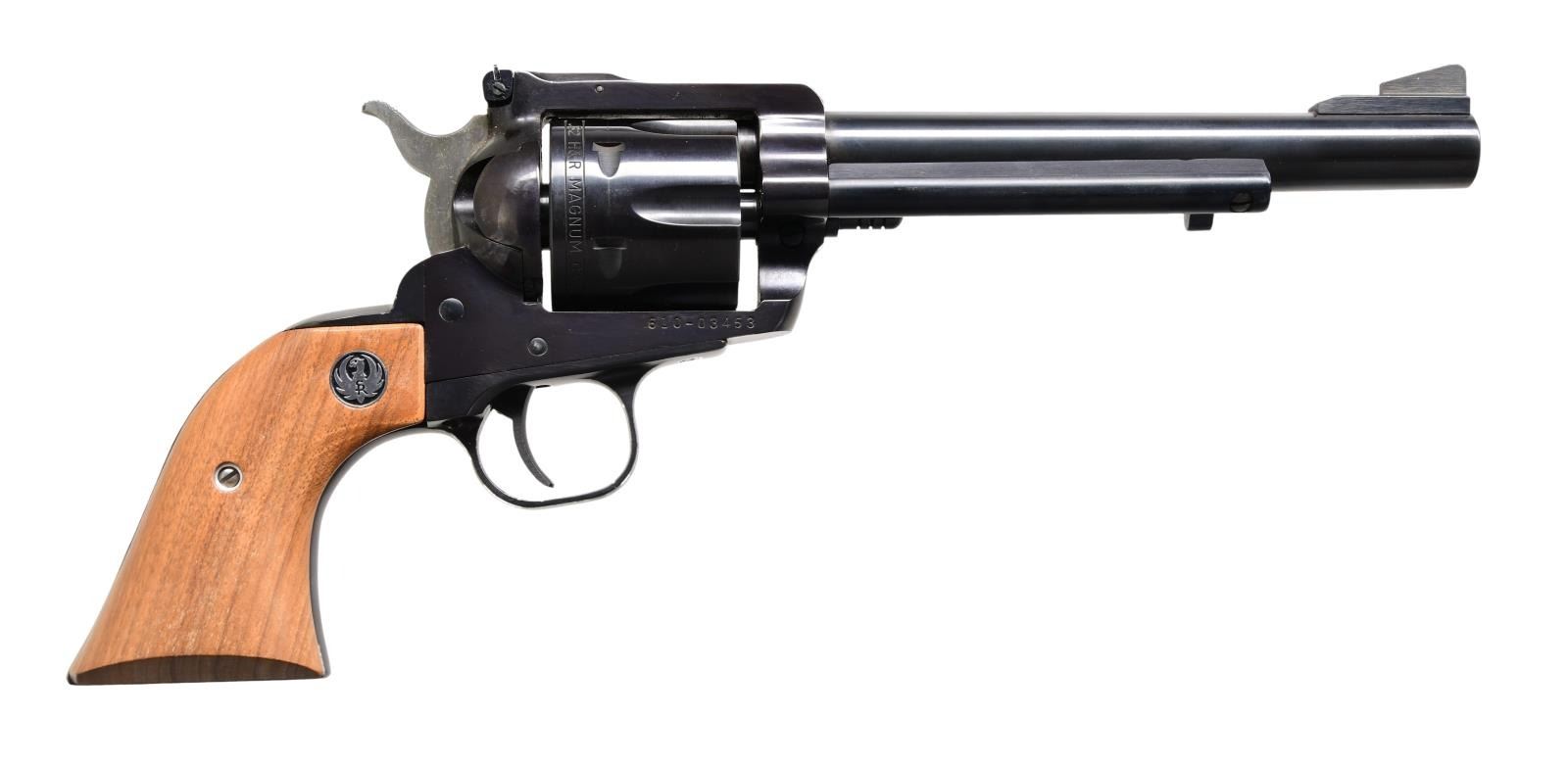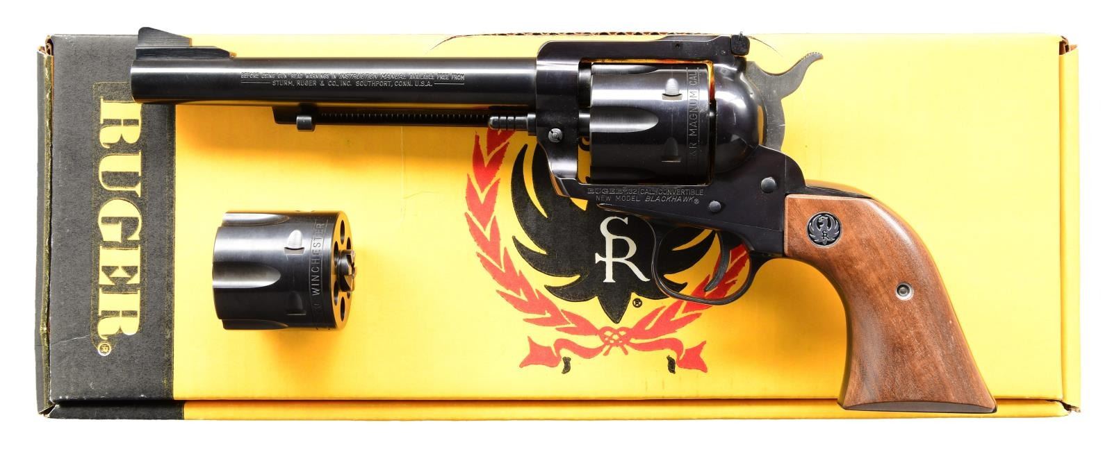 CONVERTIBLE REVOLVER. Cal. 32 H&R Mag. / 32-20. S# 610-03453. Bbl 6 1/2" with ramped serrated blade sight plus cylinder frame mounted factory adjustable rear. Only 5,042 units manufacture in 1988 only (1973 to date for all New Models) as Model 06101 having catalogue designation S-32X. Alloy ejector housing with balance blued steel including grip frame; smooth walnut grips having silver eagle medallions. Collared base pin and wide, smooth faced trigger. Top strap has bee at flower symbol of Buckeye Sports Supply in Ohio. Fluted 32 H&R Mag. cylinder is matching numbered and can also fire 32 S&W short and longs interchangeably. UNNATTACHED ACCESSORIES: labeled original factory yellow / black 1 piece box plus matching numbered sleeve with packaging to include matching numbered fluted 32-20 auxiliary cylinder. CONDITION: very faint traces of firing beyond factory test firing with balance near excellent including bore and grips. (23-6607/NW). MODERN. $650-900.