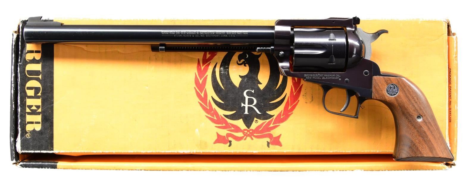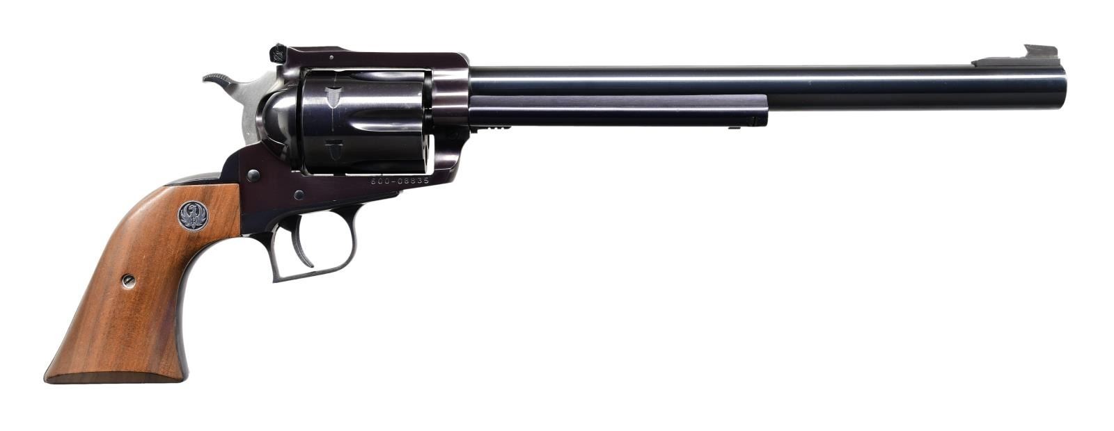 Cal. 357 Maximum. S# 600-08835. Bbl. 10 1/2" with screw-attached hooked-style ramped base target blade; factory adjustable rear on cylinder frame. Mfg. 1984 (1982–1984, approx. 16,000 units) as BNM10, based on an elongated Super Blackhawk frame. All steel with a Super Blackhawk Dragoon-style grip frame, except for the longer black anodized alloy ejector housing. Developed primarily for handgun silhouette competition as the increased power of its 38-caliber bullet was capable of solidly toppling the metal targets; also effective as a hunting handgun. The perceived problem of the barrel / cylinder gap gasses cutting the top strap led to its discontinuation. Also offered are 7 1/2" barrels for ease of carrying during hunting. UNATTACHED ACCESSORIES: original box in good condition with edge scuffs plus pulled finish by tape from end opposite label plus original paperwork. CONDITION: very slight thinning of finish at muzzle plus cylinder turn line, but near excellent overall, including bore and grips. Very minimal evidence of firing. (23-6205/NW). MODERN. $650-900.