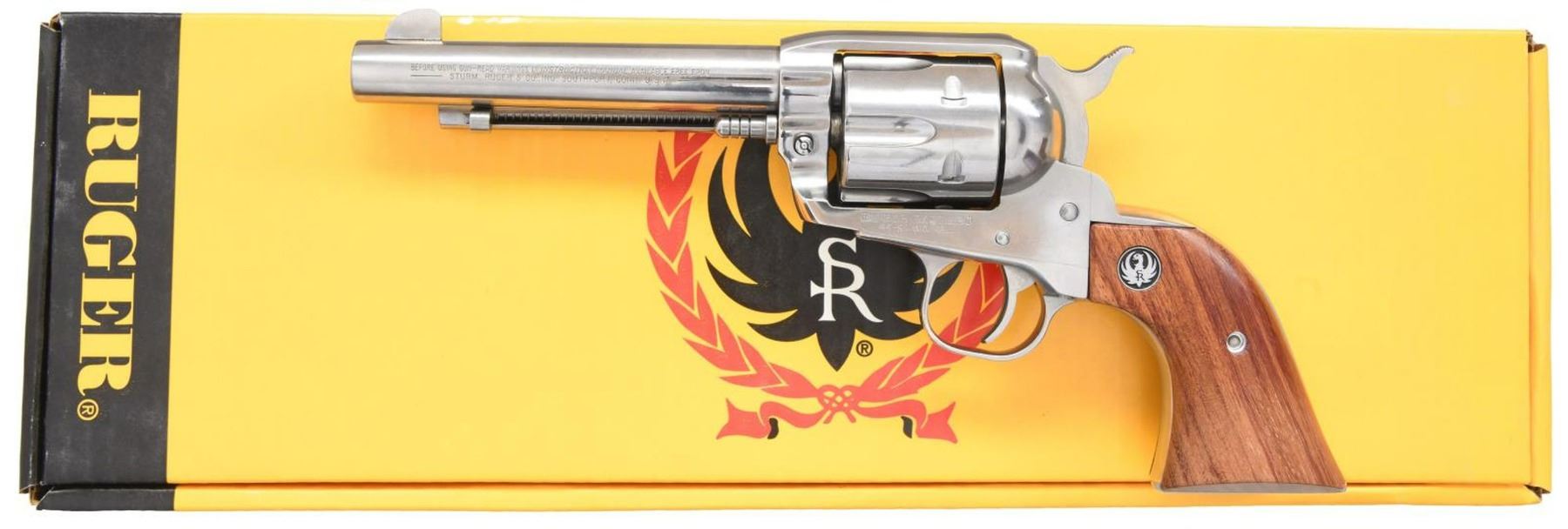 Cal. 44-40. S# 55-82844. Bbl. 5 1/2" with blade sight; frame notched rear. Mfg. 1995 (1993-2004) as Old Model stainless having rosewood grips with silver eagle medallions. Model 00544 and Catalog No. KBNV-405. UNATTACHED ACCESSORIES: original factory 1-piece box with detached label (bad glue; label included) and packaging, plus shipping sleeve. CONDITION: slight firing residue. Generally, near excellent, including bore and grips. PROVENANCE: the Lifelong Collection of Terrance McCarty. (24-117/NW). MODERN. $500-750.