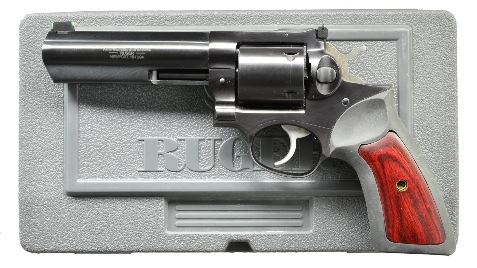 Cal. 44 Spl. S# 178-60729. Bbl. 5" w/ grooved rib having dovetailed green fiber optic sight plus white outline adjustable rear on frame. Mfg. 2018 as GP-4451-5 (Model 01765) w/ 5 rd. non fluted cyl. & Ruger rubber grip having laminated rosewood panels. UNATTACHED ACCESSORIES: matching numbered factory grey plastic case & packaging. CONDITION: very faint cyl. turn line; all other aspects near excellent appearing factory test fired only. (22-3351/NW). MODERN. $550-800.