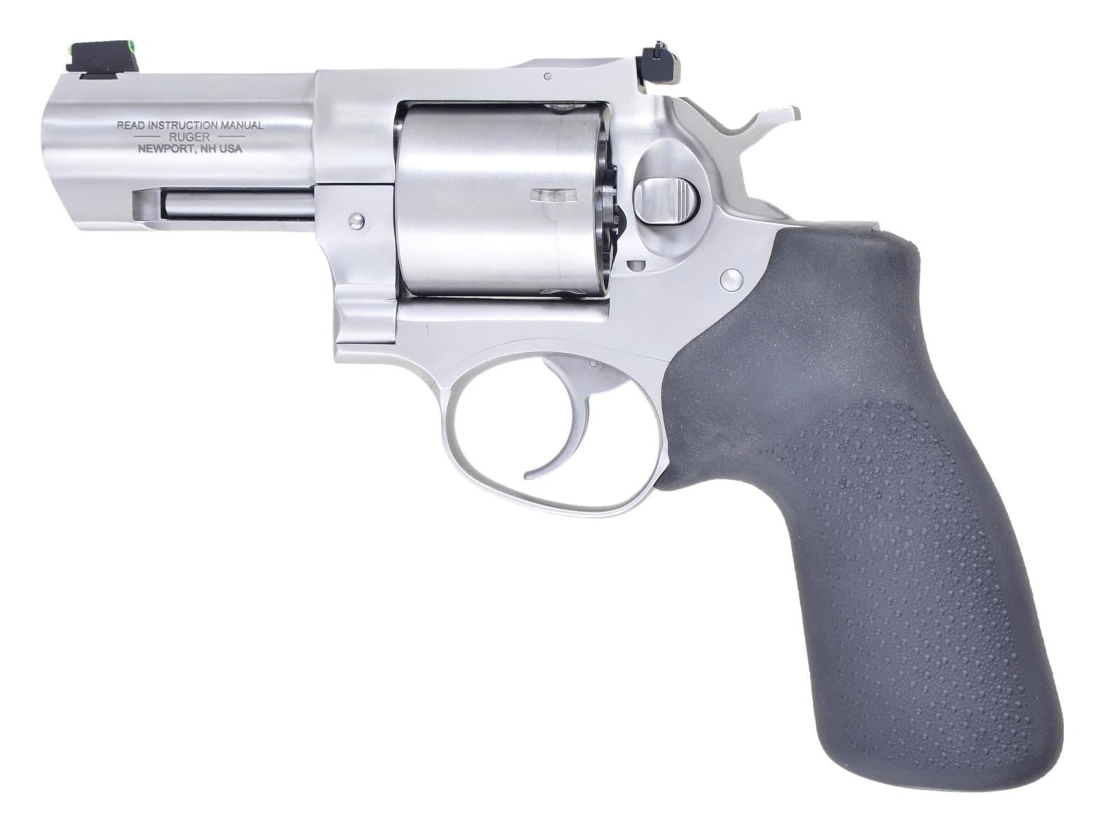 Cal. 44 Spl. S# 178-32529. Bbl. 3" w/ grooved rib having dovetailed green fiber optic sight plus white outline adjustable rear on frame. Mfg. 2016 as KGP-4431-5 (Model 01761) w/ 5 rd. non fluted cyl. & pebble grained Ruger logo rubber grip. UNATTACHED ACCESSORIES: matching numbered factory grey plastic case & packaging. CONDITION: very faint cyl. turn line; all other aspects near excellent appearing factory test fired only. (22-3358/NW). MODERN. $550-800.