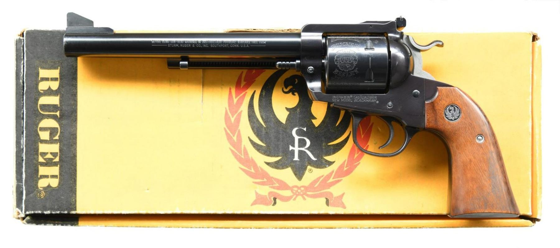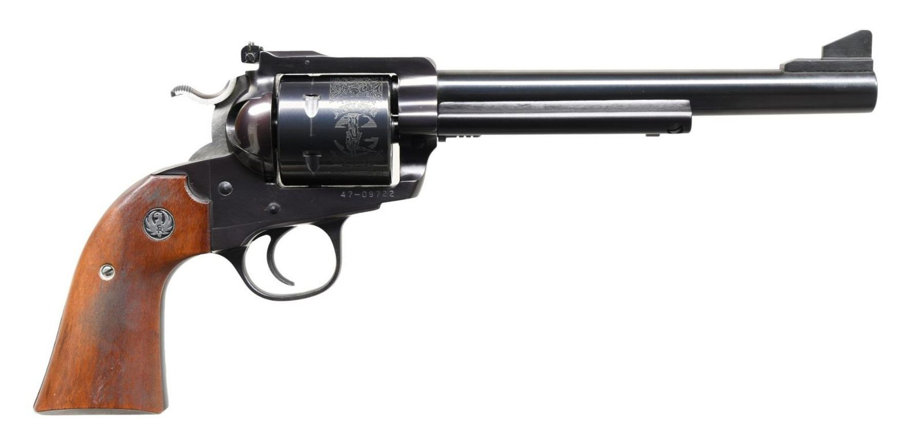 Cal. 45 Colt. S# 47-09722. Bbl. 7 1/2" with ramped serrated blade sight; frame mounted adjustable rear. Mfg. 1986 as blued Model 00447 having Goncalo Alves grips with silver eagle medallions. Bisley scene engraved unfluted cylinder. UNATTACHED ACCESSORIES: good (light scuffs) factory 1 piece yellow box with paperwork. CONDITION: light cylinder turn line plus faint cleaned firing residue; balance near excellent including bore and grips. (23-6040/NW). MODERN. $400-600.