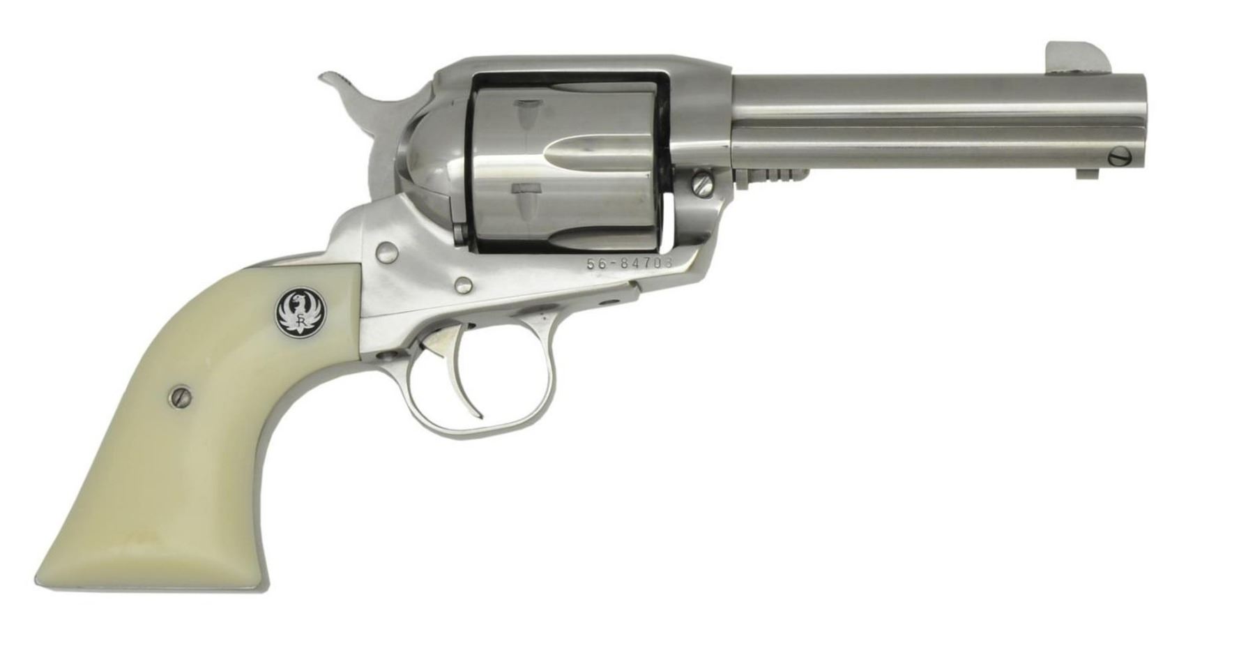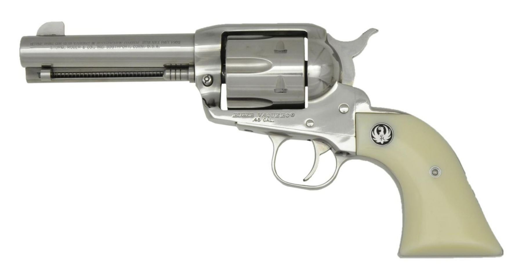 Cal. 45 Colt. S# 56-84708. Bbl. 4 5/8" with blade sight; frame notched rear sight. Mfg. 1997 (1993–2005) as Model 00558 with catalog number KBNV-44-I having gloss finish plus simulated ivory grips; silver eagle medallions. Built on a larger Old Model cylinder frame that was replaced in 2006 with a smaller-framed New Vaquero. CONDITION: top of sight blade is filed, and there is an extremely faint cylinder turn line. Light firing residue or stains, but overall, near excellent, including bore & grips. (24-916/NW). MODERN. $400-550.