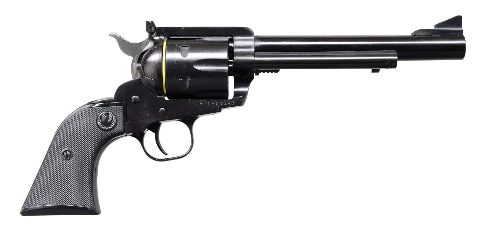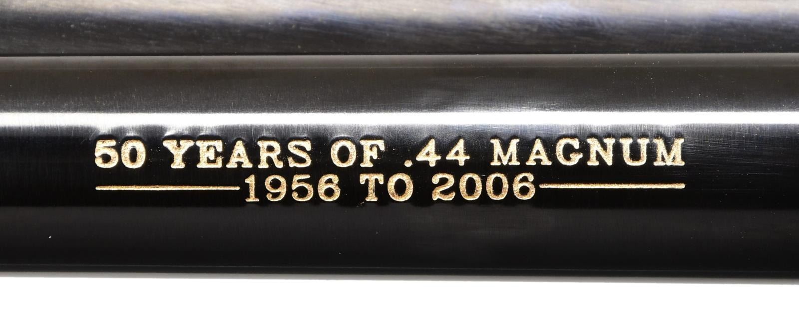 Cal. 44 Mag. S# 870-04698. Bbl. 6 1/2" with ramped serrated blade sight plus Micro frame mounted adjustable rear. Top of barrel has "50 YEARS OF 44 MAGNUM" and "1956-2006". Mfg. 2006 (2006-2008; approx. 17,000 units) with blued finish plus steel grip frame and ejector housing giving weight and feel of early frontier SA revolver. New sized grip frame to replicate the original having checkered black plastic grips with black eagle medallions. UNATTACHED ACCESSORIES: original red plastic commemorative case with 50 year logo on lid plus factory packaging. CONDITION: all aspects near excellent with new unfired appearance. (23-6896/NW). MODERN. $900-1,300.