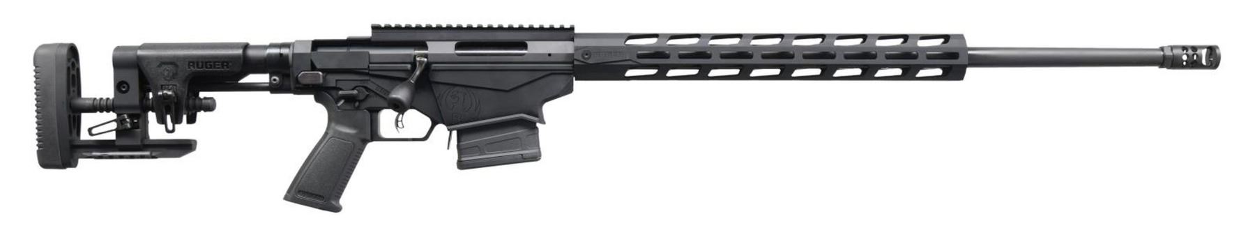 Cal. 6.5 Creedmoor. S# 1802-42466. Bbl. 24" medium contour having 5R rifling plus threaded 5/8"-24 with Ruger Hybrid Muzzle Brake (minimizes recoil and side blast noise). Mfg. 2020 as American Precision rifle with Model number 18029. Abundance of features all designed (some innovative) to enhance accuracy. Cold hammer forged rifling of 5R design for maximum accuracy potential plus minimum measurements on bore diameter and chamber dimensions. Folding stock with full adjustments that aligns recoil path with rear of receiver (rather than a bedding system) for increased accuracy. Marksman Adjustable trigger with integral safety blade. Ruger Precision MSR stock with soft recoil pad uses standard AR grips plus its buffer tube allows for different AR compatible buttstock configurations. Magazine well has patented interface design that even works with some M-14 magazines as well as intended AICS, SR-25, etc. Bolt handle threaded 5/16"-24 to allow use of custom handles. Factory installed 20 MOA Picatinny base secured with 8-40 screws (stronger than industry standard of 6-48 screws). One of the best industry values for extreme long range precision shooting plus universally recognized high performance. MAGS: 2 factory supplied Magpul PMAG 10 rd, UNATTACHED ACCESSORIES: factory box and packaging. CONDITION: all aspects near excellent with new, unfired appearance. PROVENANCE: The Collection of Gun Sport Ltd. owned by Jon R. Thomas. (23-3372/NW). MODERN. $1,000-1,500.