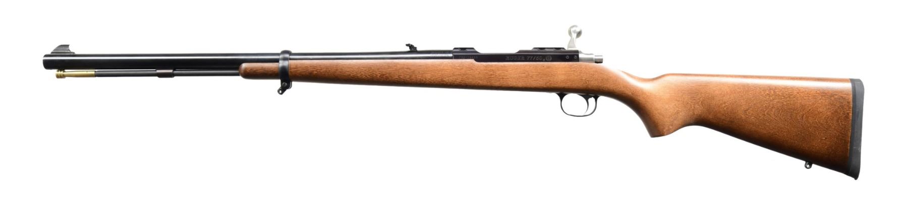 Cal. 50. S# 730-19430. Bbl. 22". Gold bead front sight. Folding rear sight. Receiver is factory grooved for scope mounting. Blued finish. Birch stock with bottom-mounted sling studs. Brass-tipped ramrod is present. UNATTACHED ACCESSORIES: matching-numbered factory box with manual, Ruger rings, and cable lock. CONDITION: all aspects are near excellent. (01-25508/MJC). MODERN. $200-400.