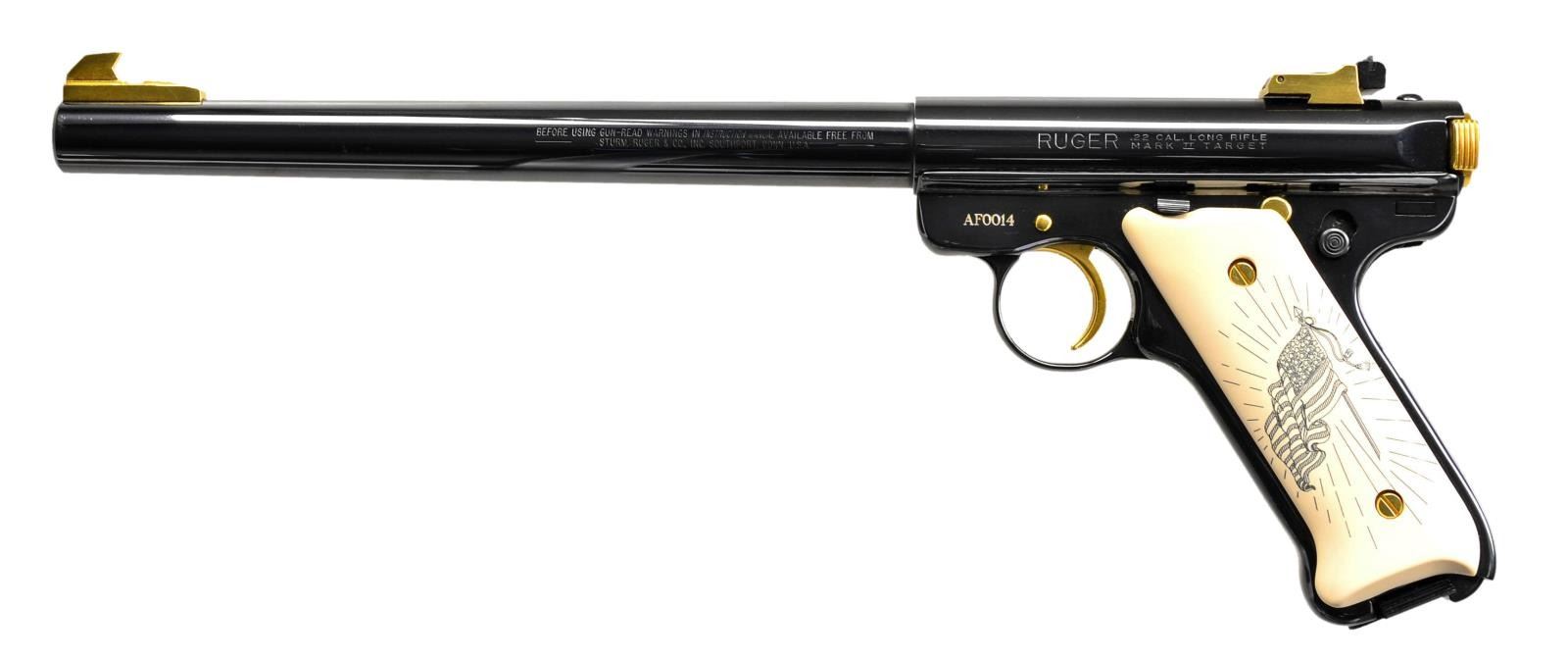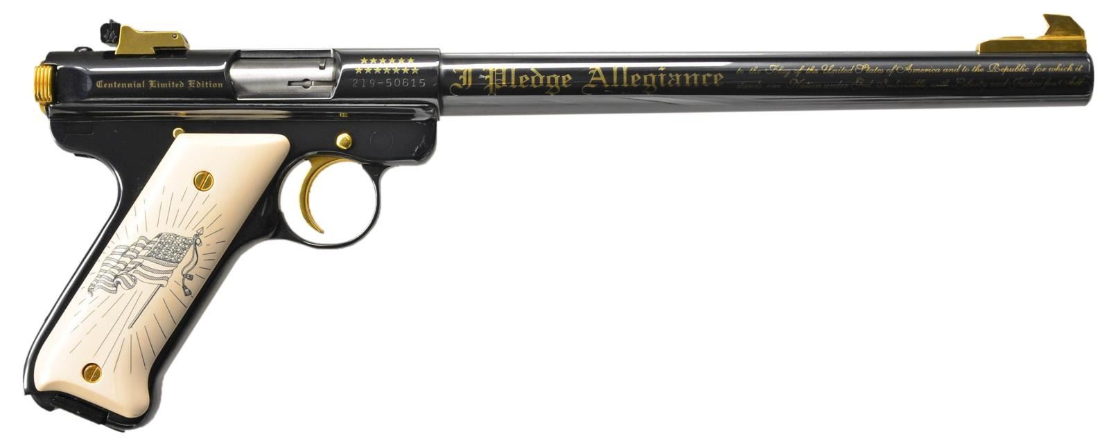 SEMI-AUTO PISTOL. Cal. 22 LR. S# 219-50615. Bbl. 10" with gold script lettering plus a gold-plated factory screw-mounted undercut target sight; factory receiver-mounted adjustable rear with gold-plated base. Mfg. 1993 (1982–2004); embellished by the American Historical Foundation on their high gloss finish by adding the Pledge of Allegiance in gold script along with other gold accents and the number "AF0014 on the left front of the frame; limited to 1,000 units. Uncommon and desirable Ruger pistol with enough barrel area for the Pledge. Right rear of receiver with "Centennial Limited Edition" in gold plus American flag on each grip of faux ivory; gold grip screws. As an added decorative touch, the cocking ears of the bolt, frame pins, and trigger are gold-plated. MAGS: 1 factory, 10 rd. CONDITION: all aspects are near excellent, with a like-new, unfired appearance. (24-6286/NW). MODERN. $450-600.