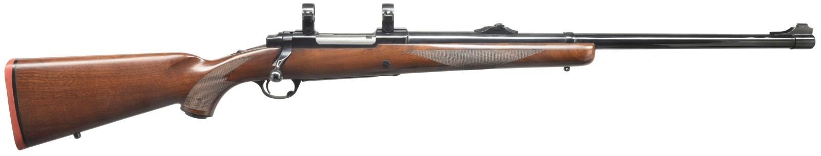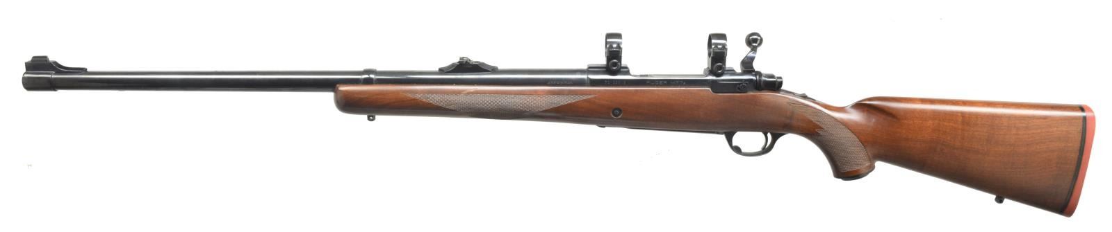 Cal. 458 Win. Mag. S# 71-12003. Bbl. 24” rnd. Banded front ramp w/ bead front sight & screw on island rear w/ dovetail adj. flip up rear sight. Checkered walnut stock. Checkered pistol grip. Black synthetic grip cap w/ Ruger emblem. Solid red Ruger pad. Recoil bolt is present. CONDITION: bbl. retains most of its original blue w/ a few minor marks. Receiver retains its original blue w/ some thinning on sharp edges. Floor plate & trigger guard retain most of their original blue. Stock has original finish w/ a few minor nicks & scratches, has good checkering. Bore is good w/ some fine scattered pitting in front of chamber. (20-4172/BT). MODERN. $600-900.