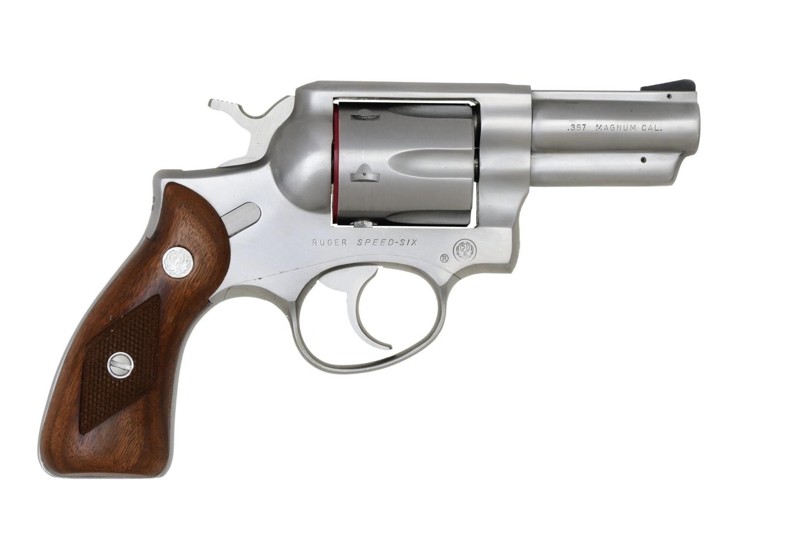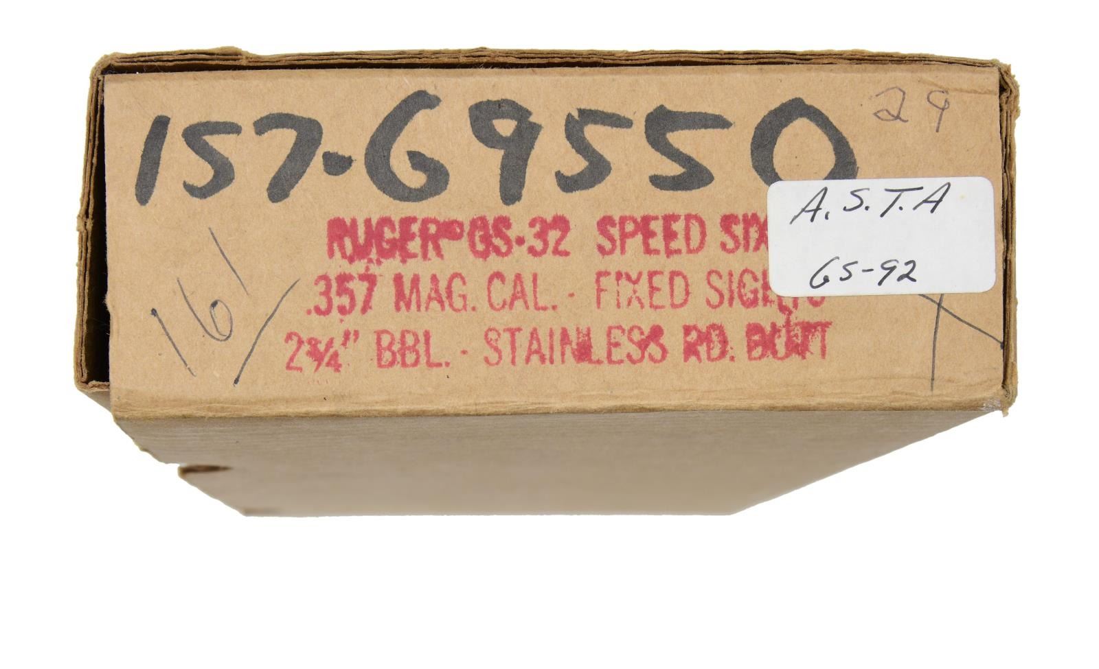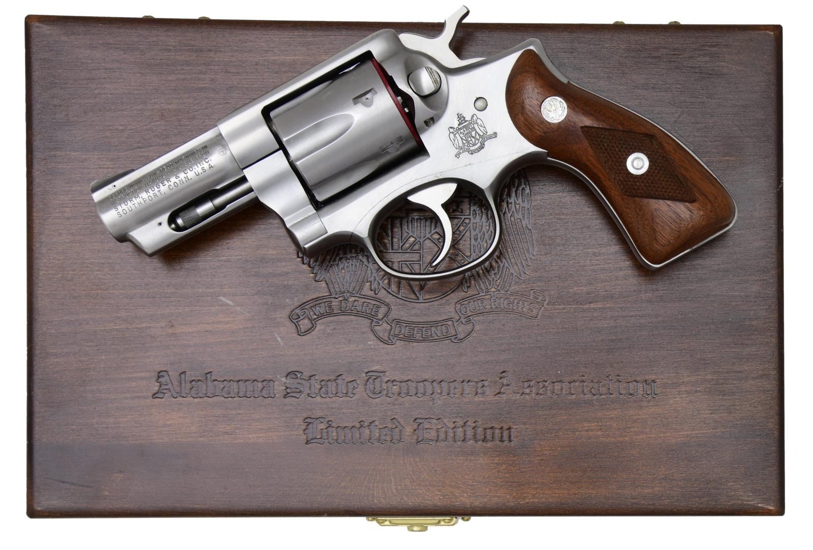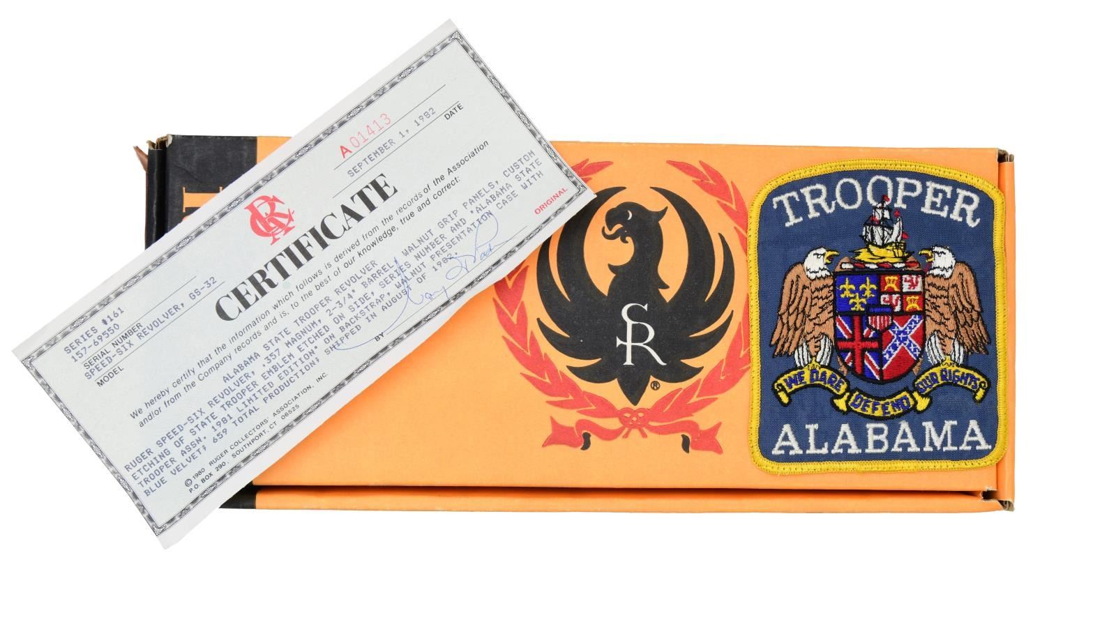 SIX STAINLESS REVOLVER. Cal. 357 Mag. S# 157-69550. Bbl. 2 3/4" fully shrouded w/ pinned blued serrated blade sight; frame notched rear. Mfg. 1981 (1973-1988 for all Speed-Sixes) & shipped August of 1982 as limited edition commemorative; #161 of 659 units. Round butt stainless frame w/ checkered walnut service grips having sm. all silver eagle medallions. Model designation of GS32-RB. Left side of frame has Alabama State Troopers' logo. Backstrap has "LIMITED EDITION 161" near top & "ALABAMA STATE TROOPERS ASSN. 1981" running down back strap. UNATTACHED ACCESSORIES: original yellow / black 1 piece box with shipping sleeve & packaging. Walnut presentation case w/ AST logo on top. Royal blue interior having satin under lid with repeat of AST logo plus velvet in base w/ revolver outline. Case has brass hardware, light marks & no key for lock. AST shoulder patch & Ruger Collectors' Association Certificate of authenticity dated Sept. 1, 1982. CONDITION: Extremely faint cylinder turn line & light firing residue on face of cylinder; remainder is near excellent including bore & grips. (23-6927/NW). MODERN. $1,000-1,300.
