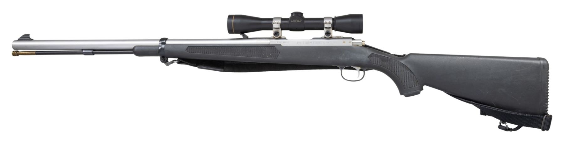 Cal. 50. S# 730-16838. Bbl. 22" (1 in 28" twist rate) with dovetailed brass bead front sight and folding leaf rear sight. Mfg. 2004 (1997-2004) as stainless K77/50RSP having checkered black synthetic stock with grip cap and grooved rubber buttpad. Factory scope rings holding Leupold M8 Shotgun 4X black finished scope with heavy Duplex reticle. Sling bases on stock and barrel band with black padded nylon sling. Fitted with black synthetic ramrod having brass jag tip. CONDITION: very good to excellent overall with traces of cleaned firing residue. Very faint use marks. Near excellent bore. High quality modern muzzle loader having ease of maintenance stainless construction. (01-27868/NW). ANTIQUE. $450-600.