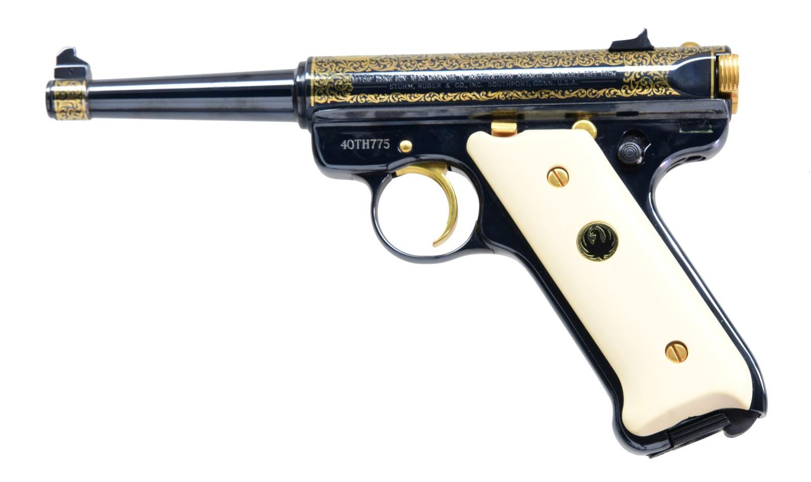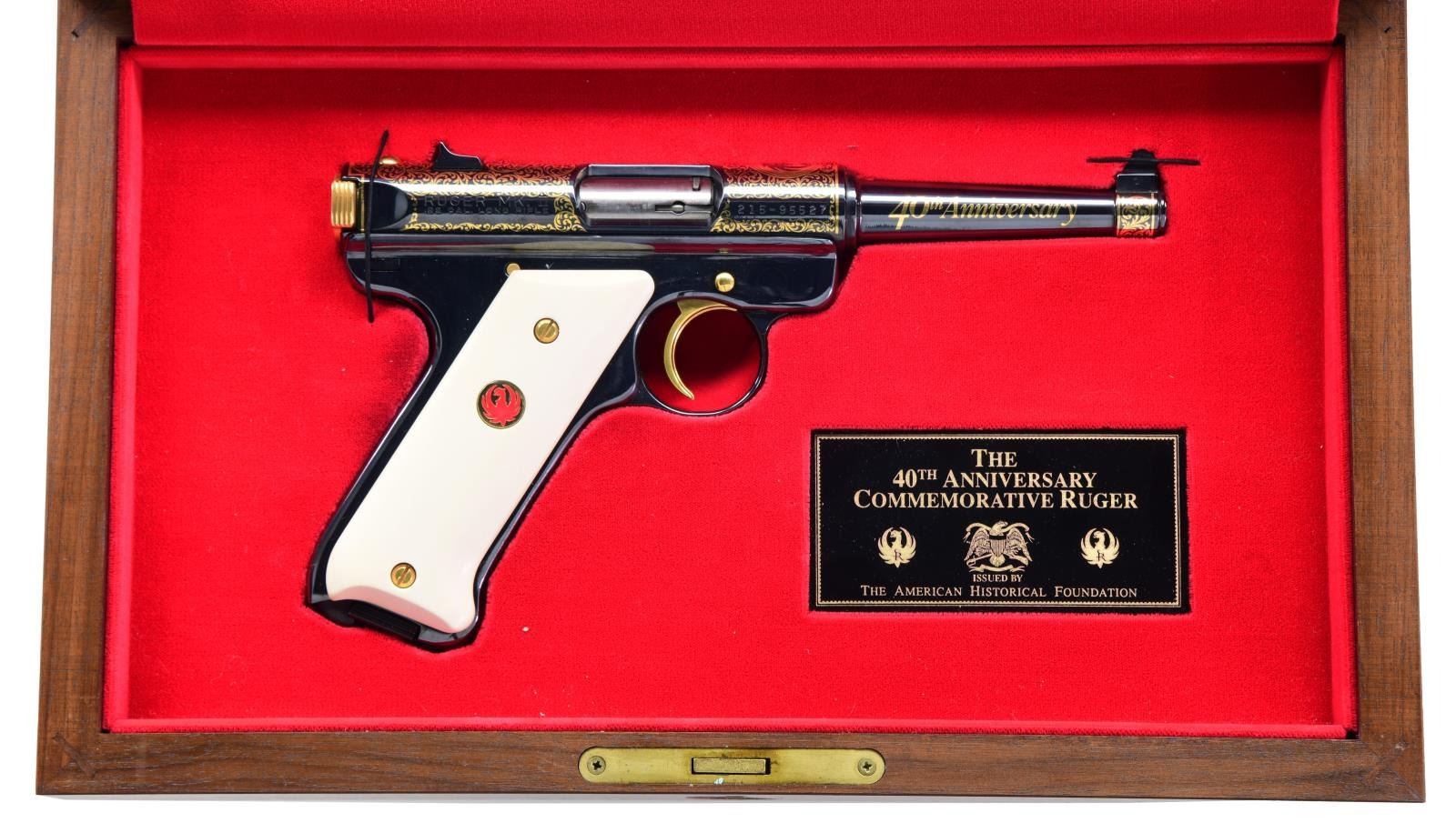 ANNIVERSARY COMMEMORATIVE SEMI-AUTO PISTOL. Cal. 22 LR. S# 215-95527. Bbl. 4 3/4" with gold embellishments and lettering. Mfg. 1990 (1982–2005) by Ruger and enhanced by AHF with a high gloss finish and numerous gold accents, plus simulated ivory grips, commemorating Ruger's 40th anniversary of 1989. Eagle grip medallions are black on the left and red on the right. Left front by trigger guard marked "40TH775" (limited to 950 units). MAGS: 1 factory, 10 rd. UNATTACHED ACCESSORIES: glass-topped walnut display case (no key) with pistol outline in red velvet plus AHF plaque. Light marks on the lid portion of the case CONDITION: all aspects are near excellent, including bore and grips; appears new and unfired. (23-6285/NW). MODERN. $350-500.